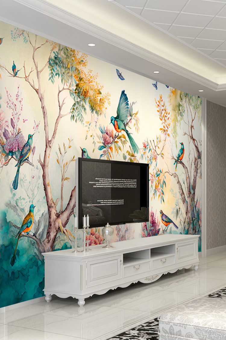 Renkli Kuşlar ve Doğal Çiçeklerle Duvar Kağıdı