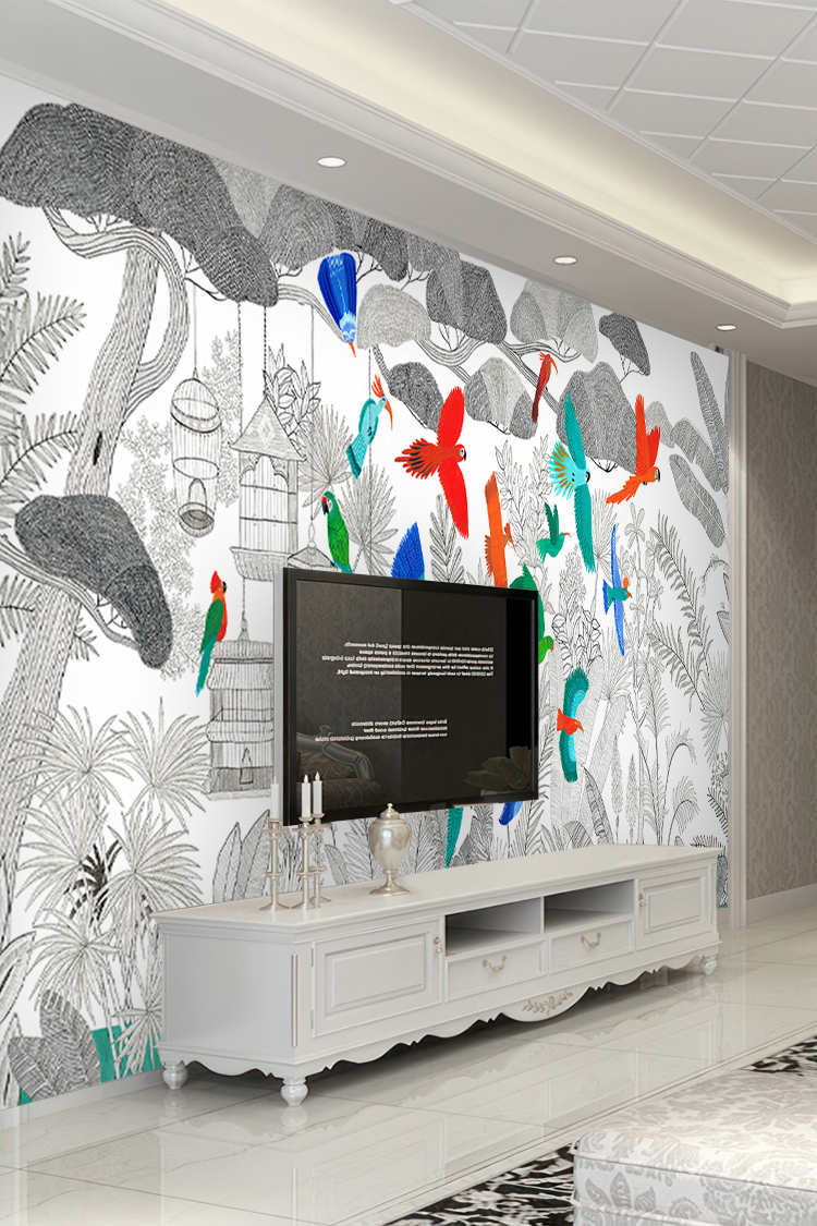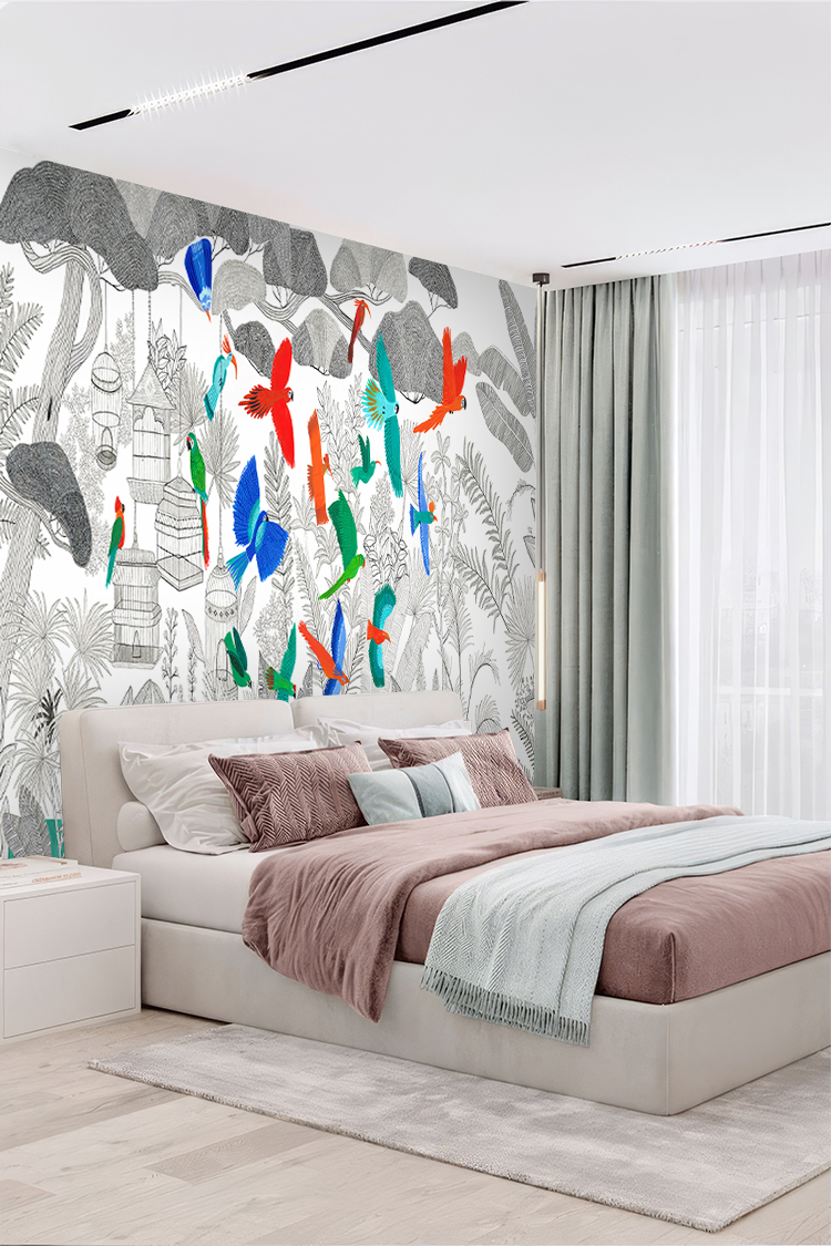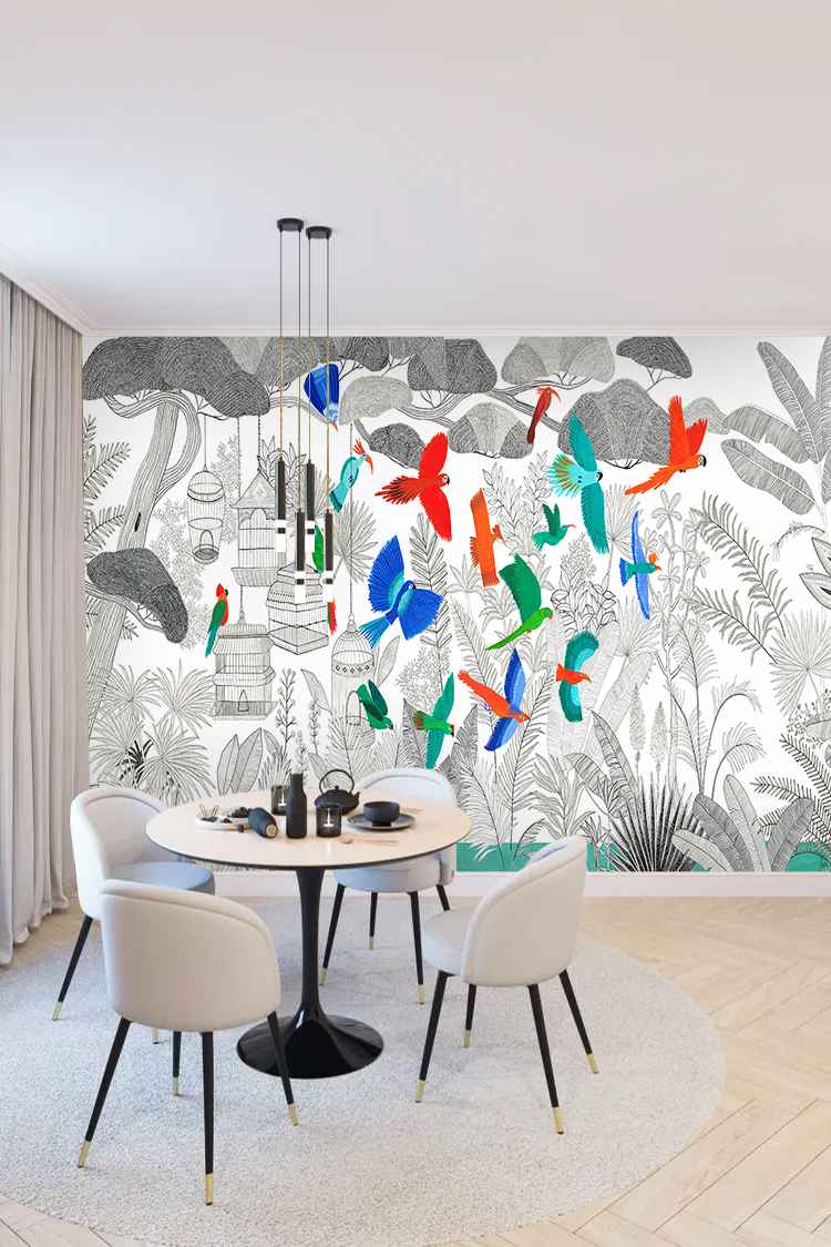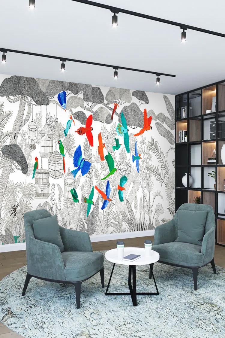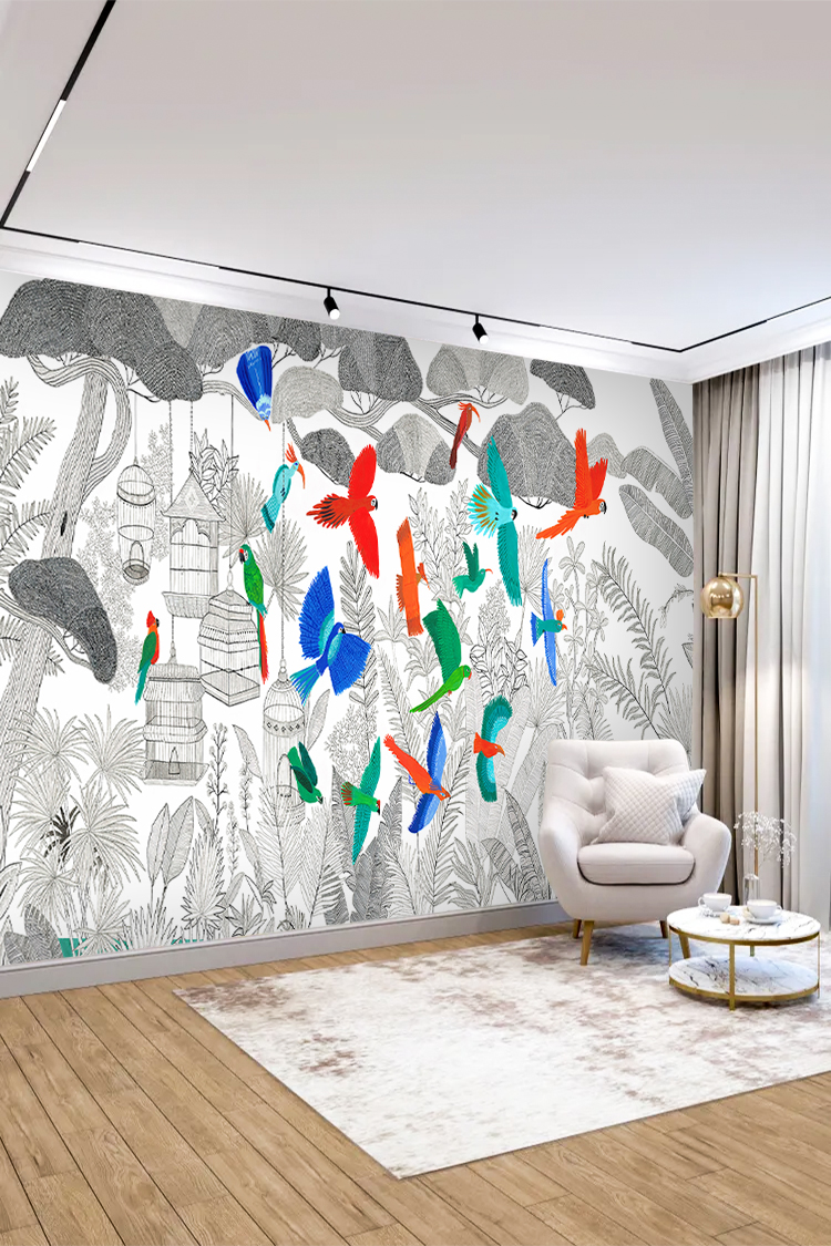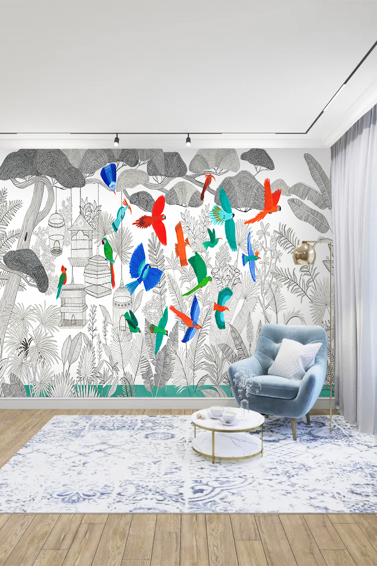 Renkli Kuşlar ve Tropikal Desenli Duvar Kağıdı