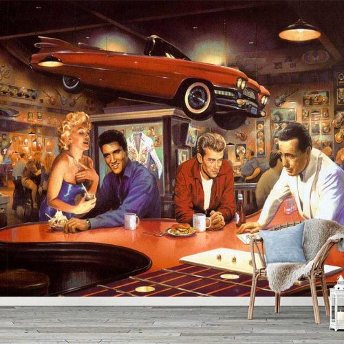 Retro Kafe ve Klasik Arabalar Temalı Duvar Kağıdı