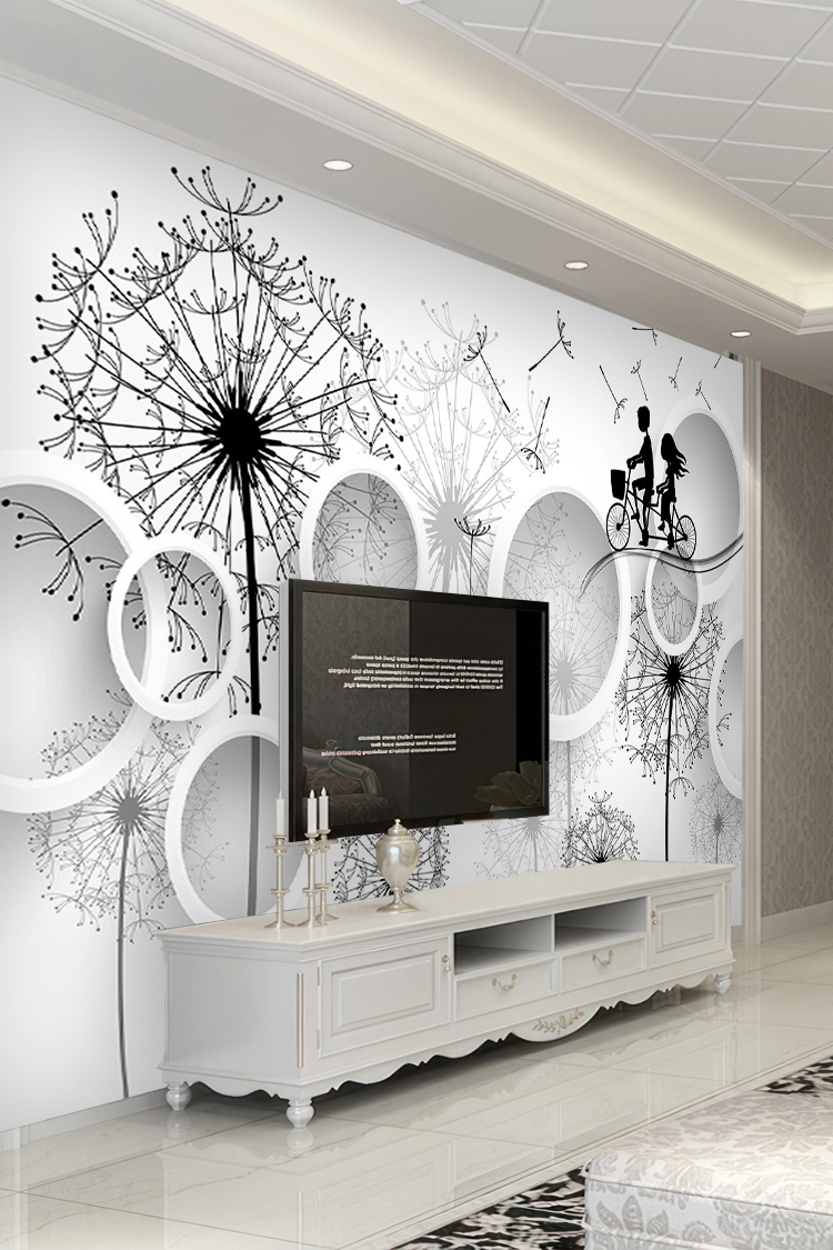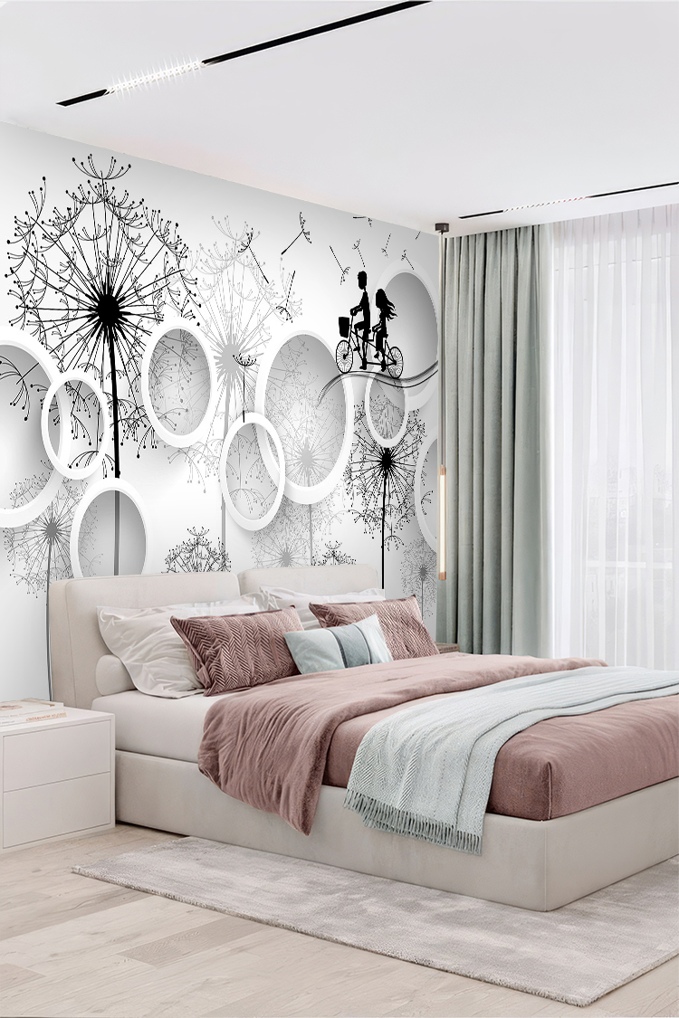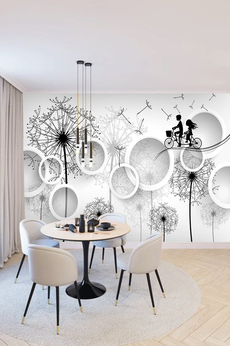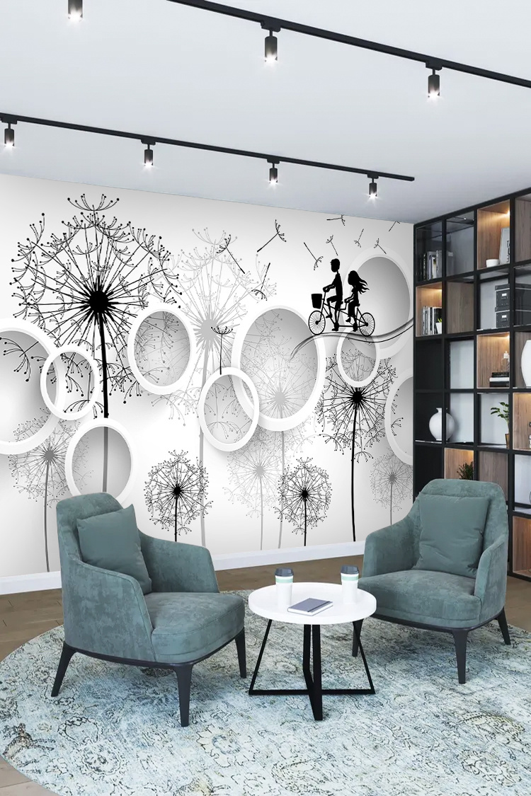 Siyah Beyaz Dandelion ve Geometrik Çerçeve Desenli Duvar Kağıdı
