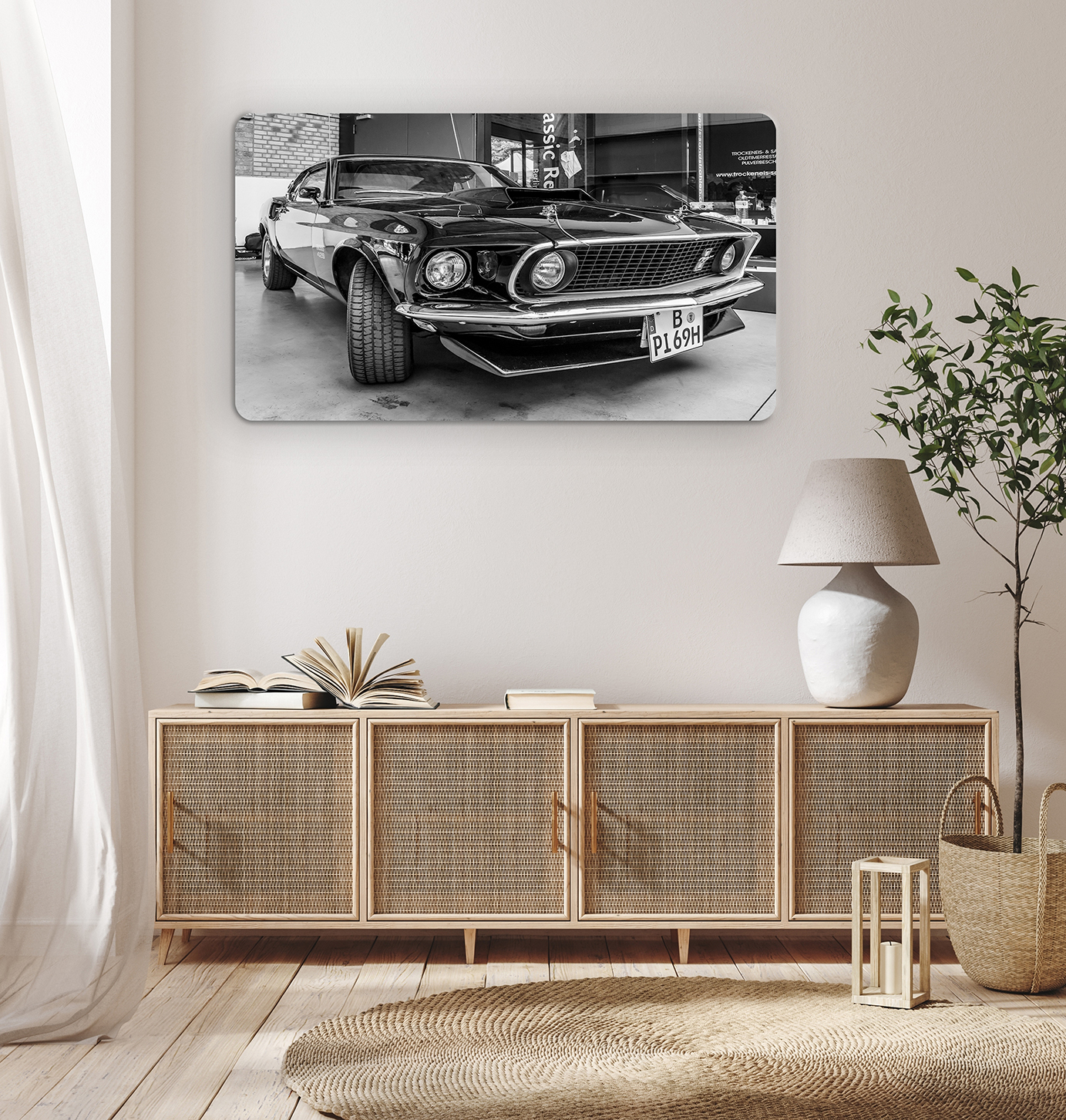 Siyah Mustang Araba Duvar Kağıdı – Retro Tasarım ve Şehir Havası 🎨🚂