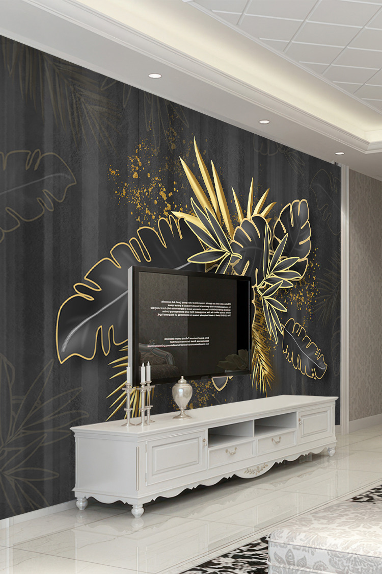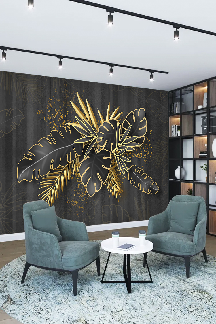 Siyah Zemin ve Altın Tropikal Yapraklarla Modern Duvar Kağıdı