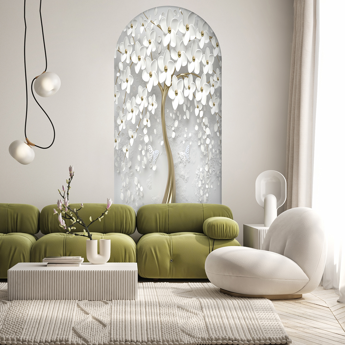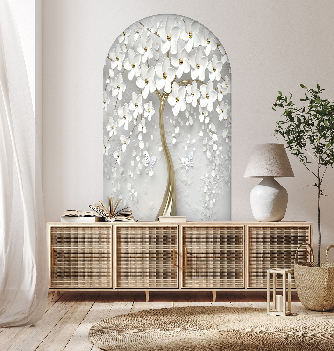 Soyut Çiçekli Ağaç Duvar Kağıdı – Beyaz ve Altın 🎨🚂