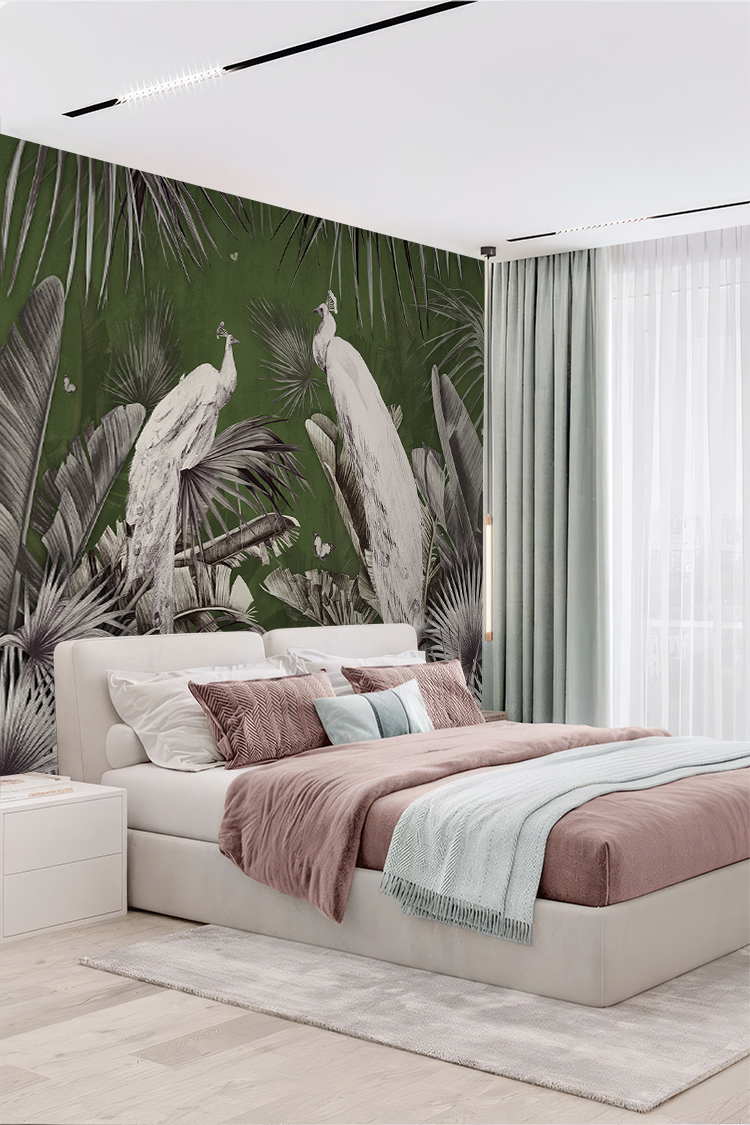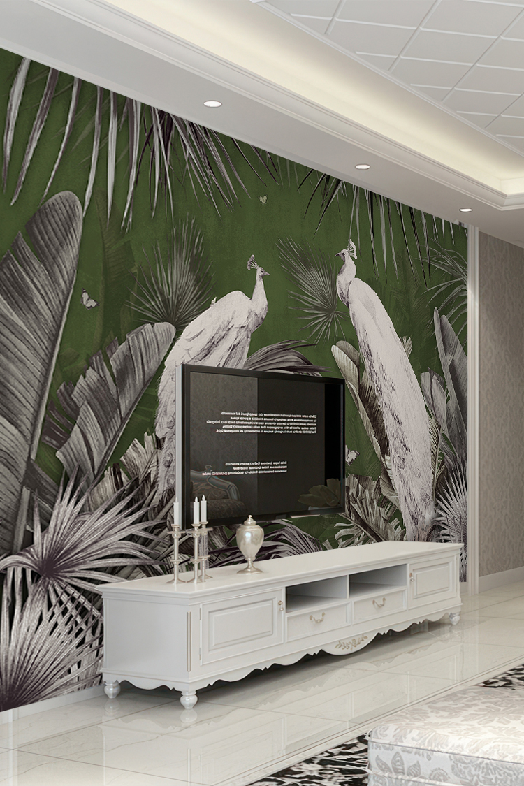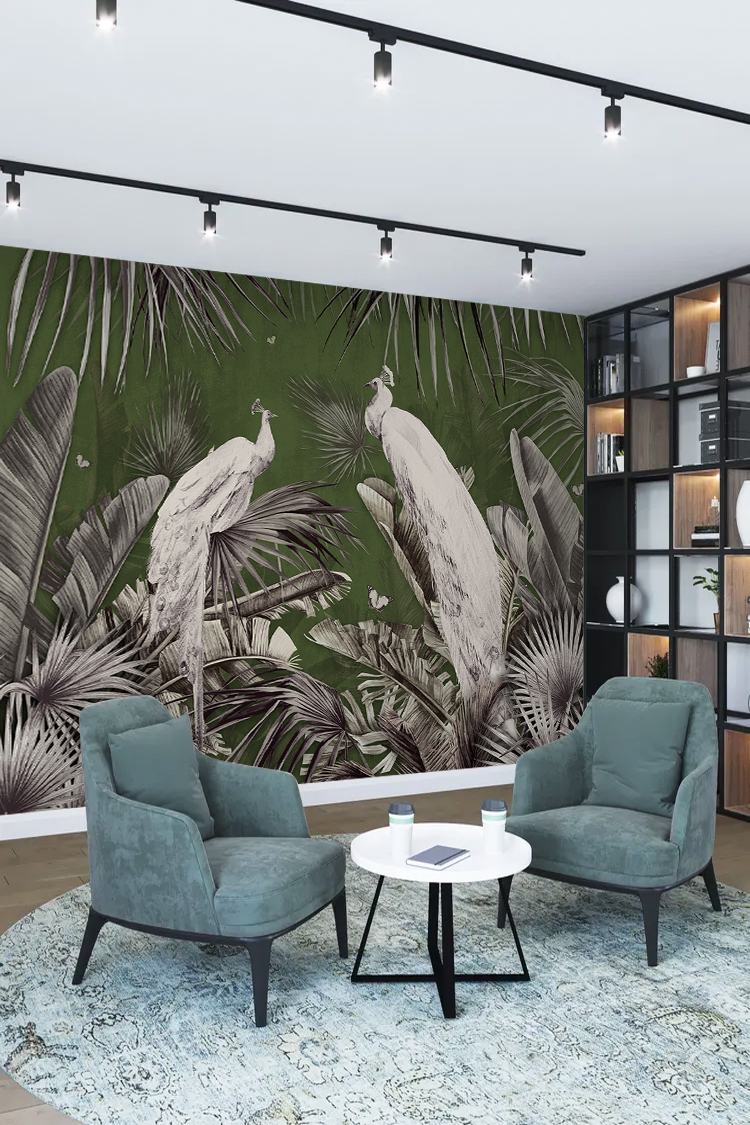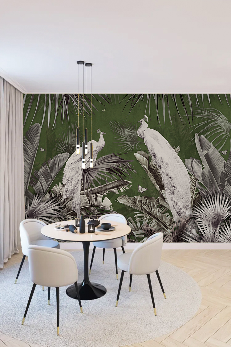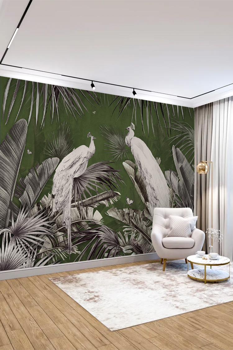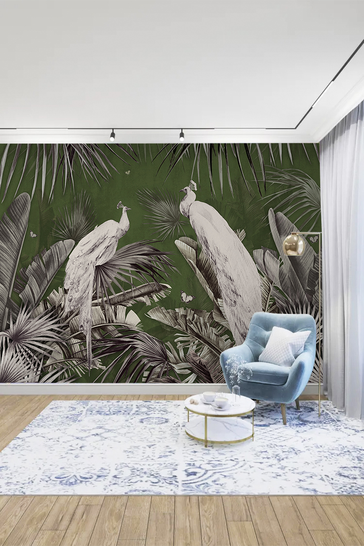 Tavus Kuşu ve Tropikal Desenli Duvar Kağıdı
