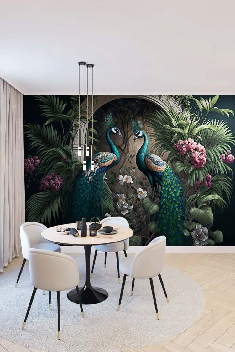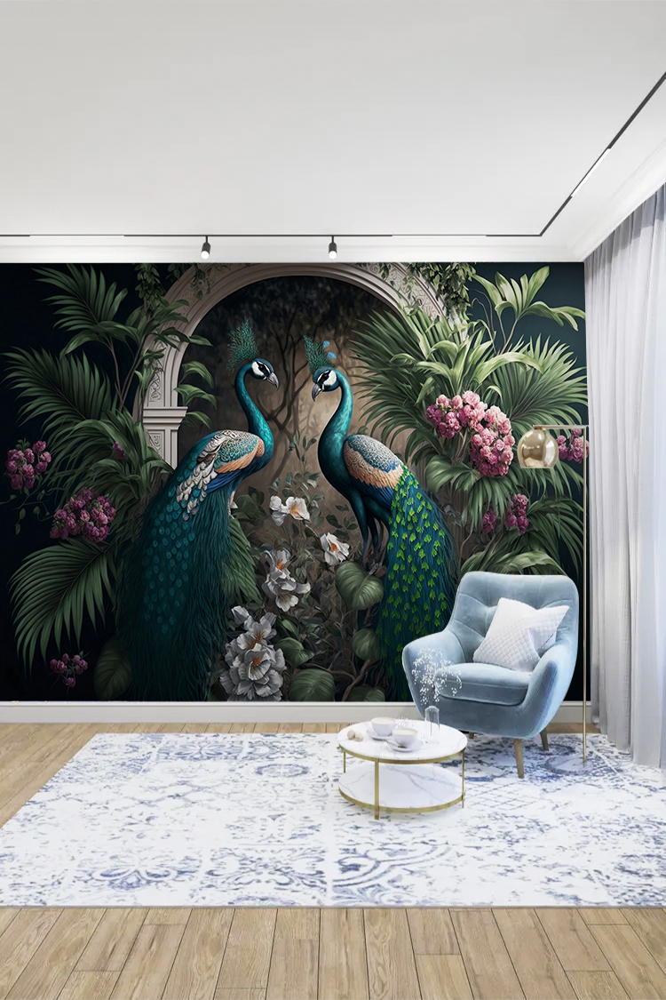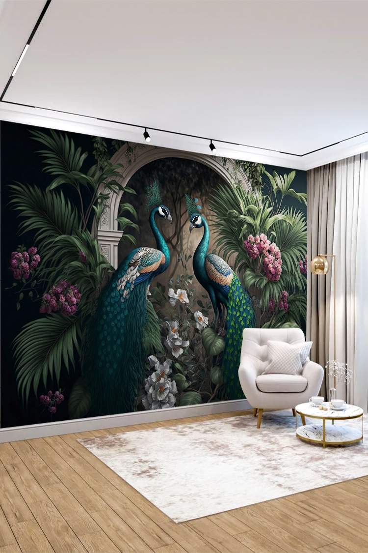 Tavuskuşları ve Tropikal Bitkilerle Zarif Duvar Kağıdı