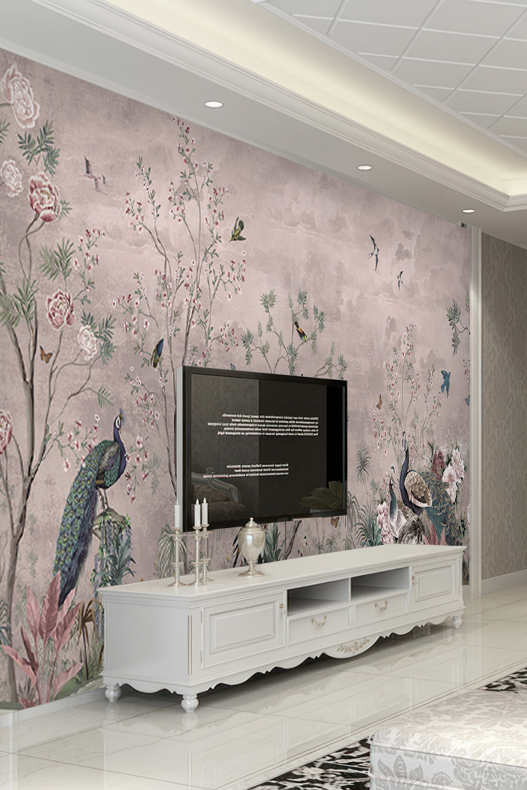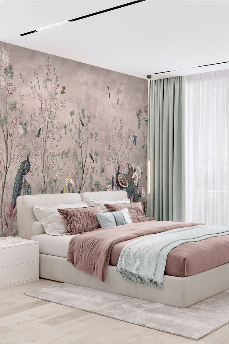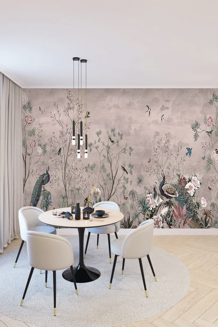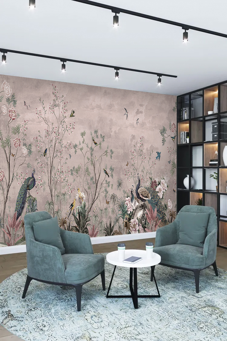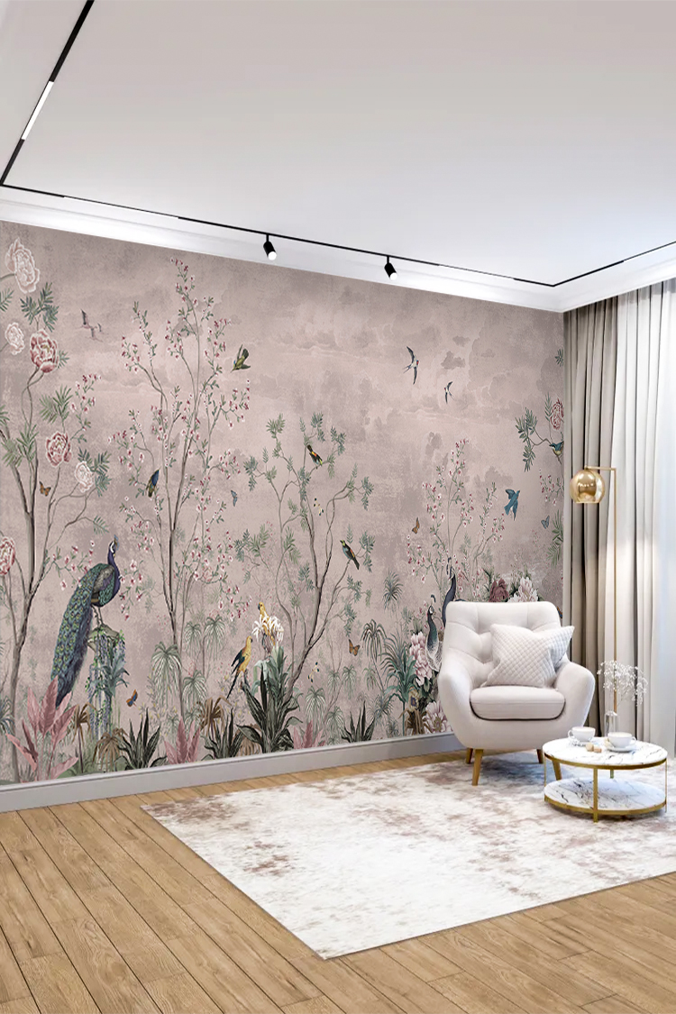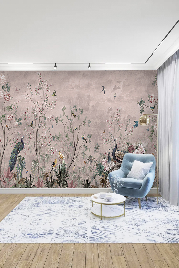 Tavuskuşu ve Çiçek Desenli Duvar Kağıdı
