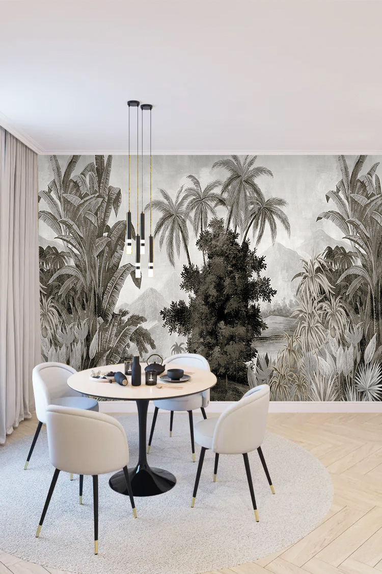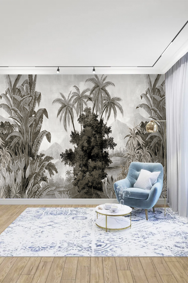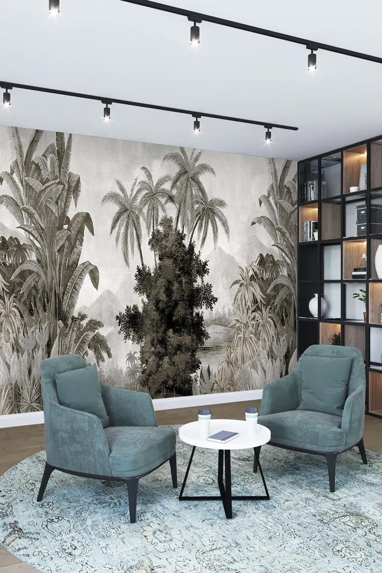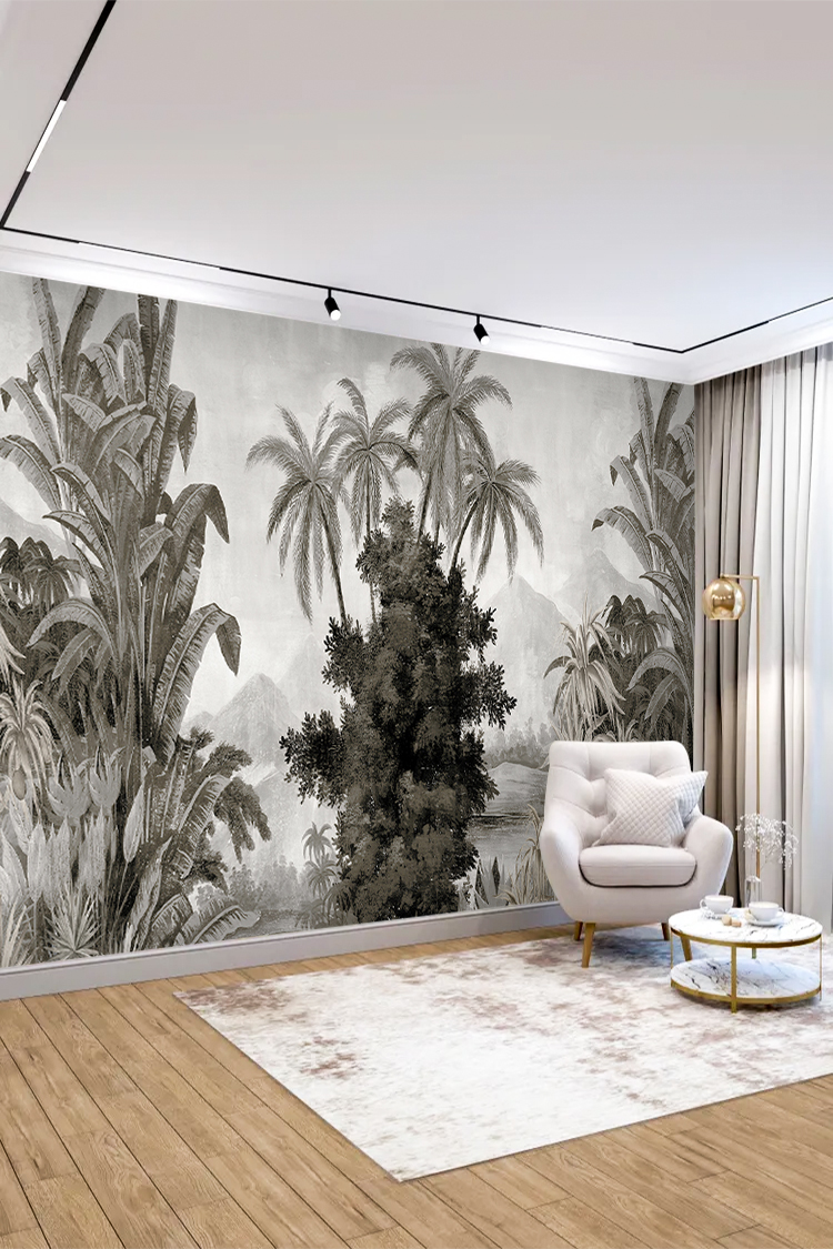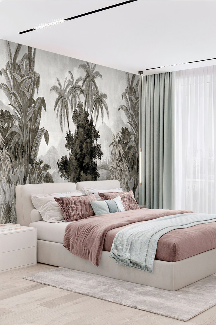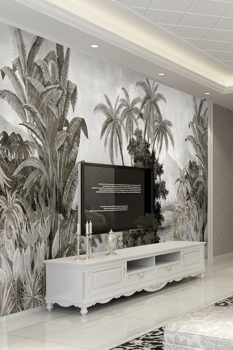 Tropikal Bitki Desenli Doğal Tonlu Duvar Kağıdı
