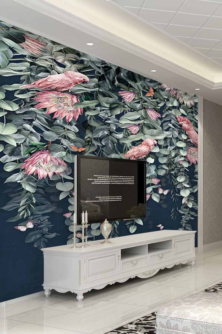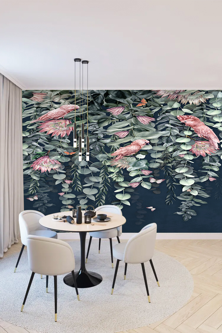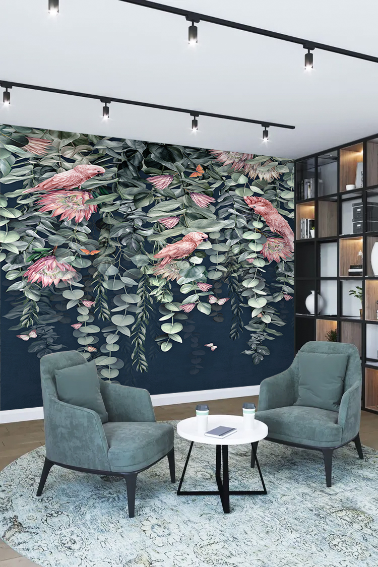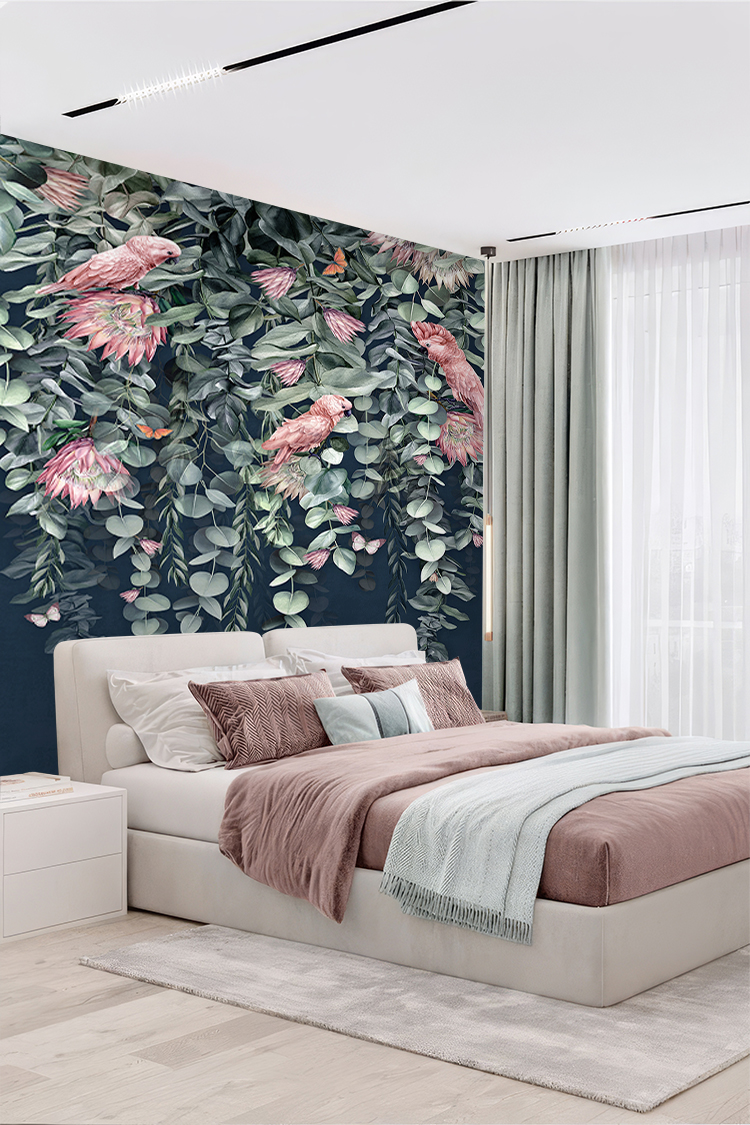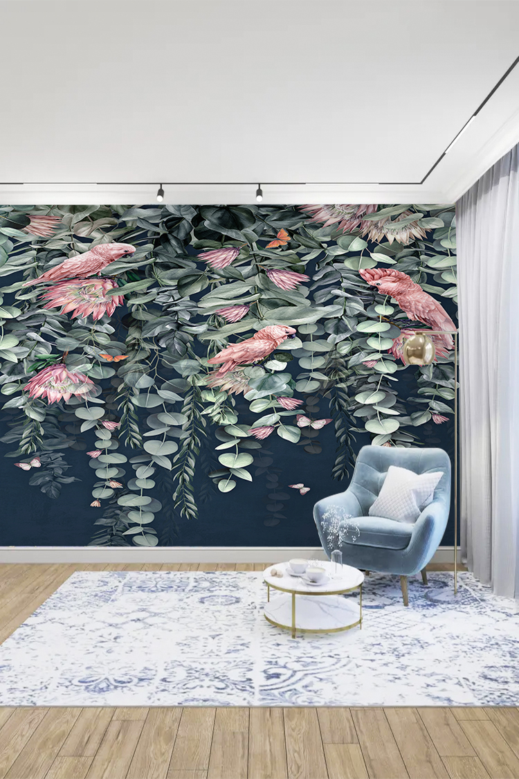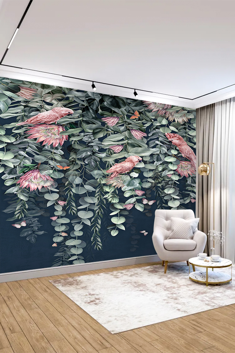 Tropikal Çiçek ve Kuş Desenli Duvar Kağıdı