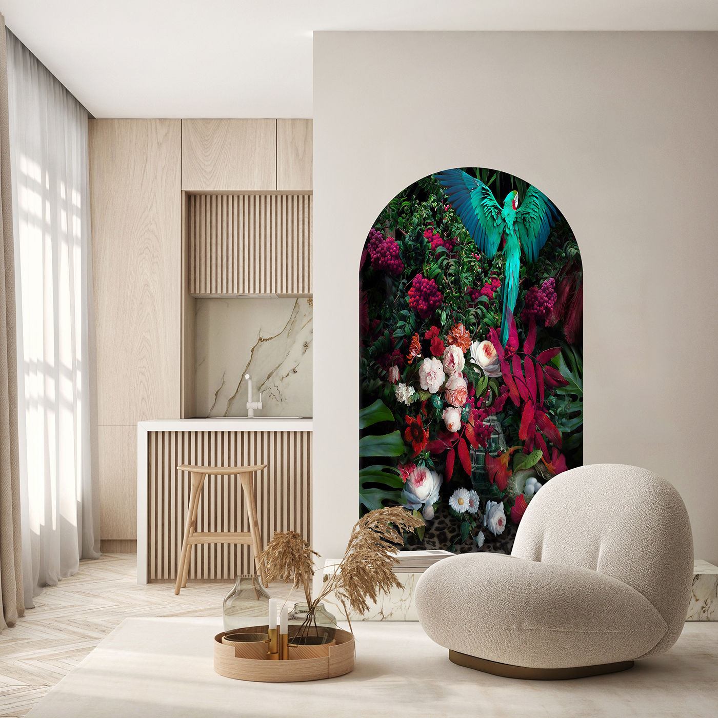 Tropikal Çiçekler ve Papağan Duvar Kağıdı – Renkli Doğal Tasarım 🎨🚂