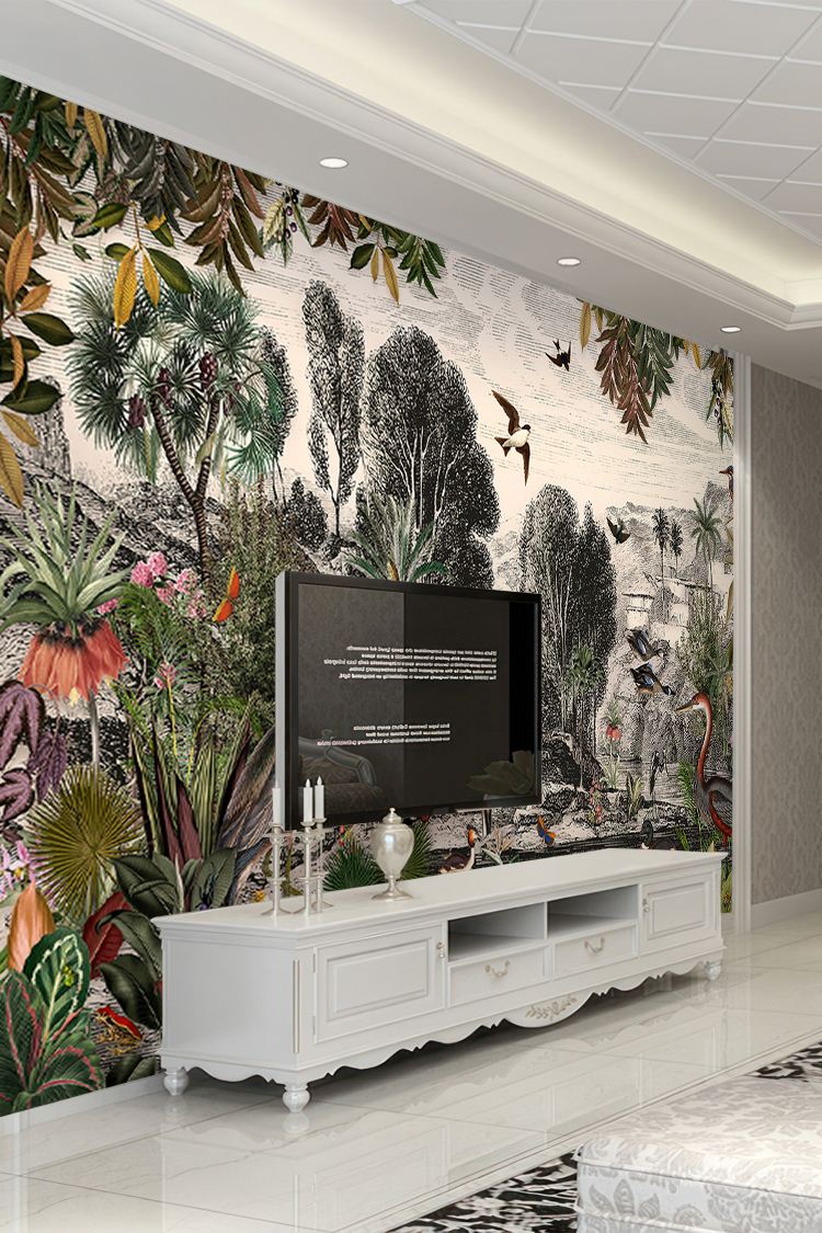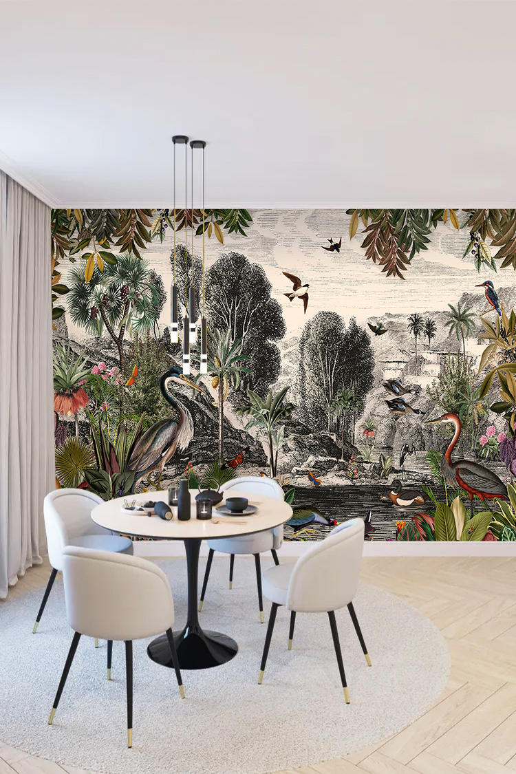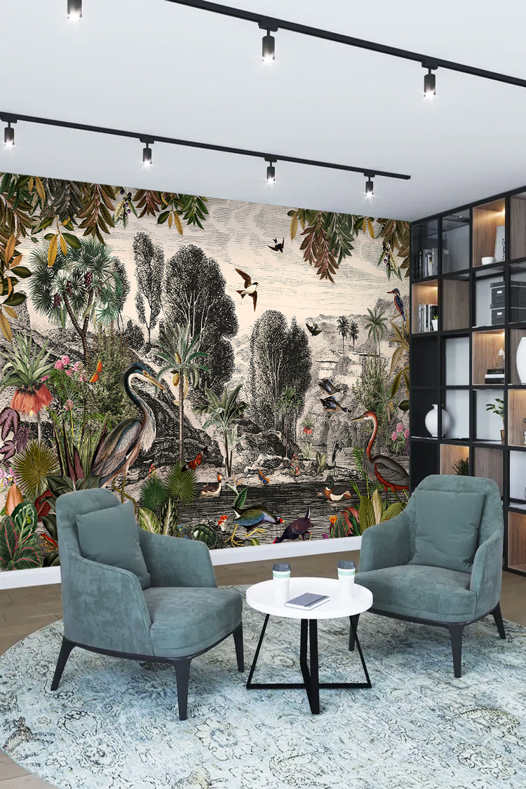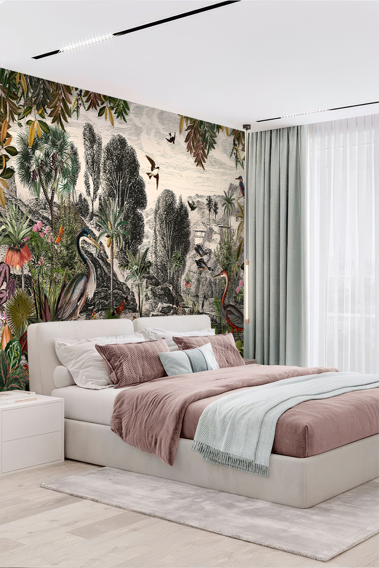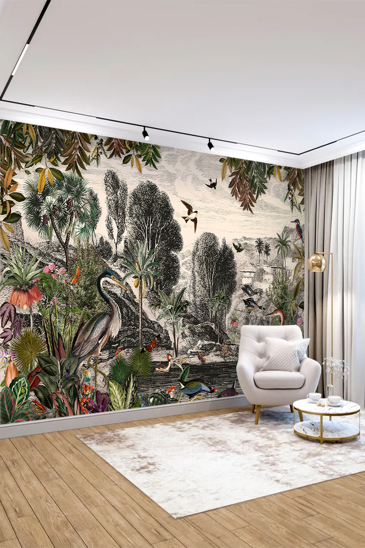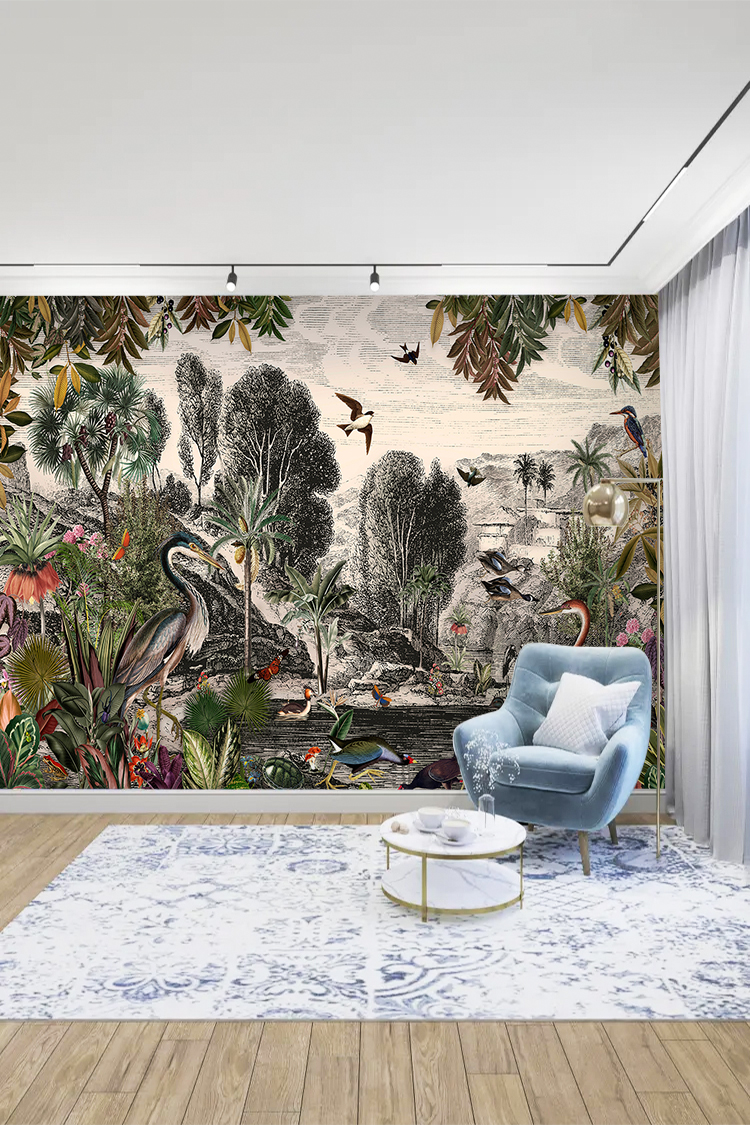 Tropikal Kuşlar ve Bitkiler Deseni Duvar Kağıdı