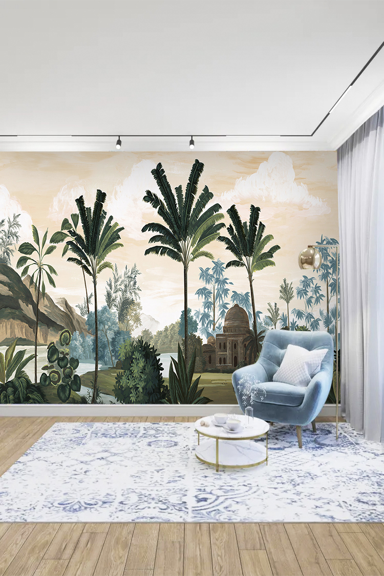 Tropikal Palmiye Desenli Doğal Tonlu Duvar Kağıdı
