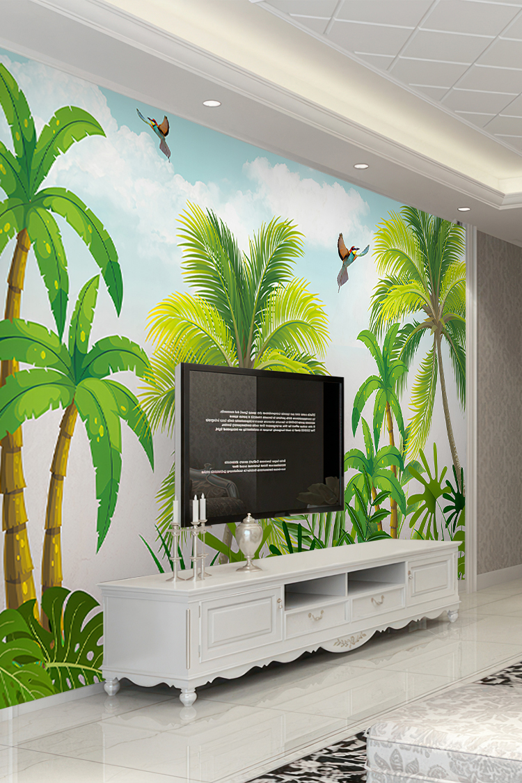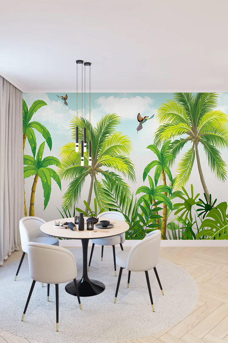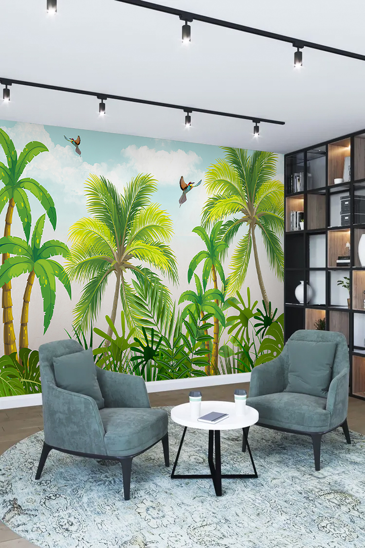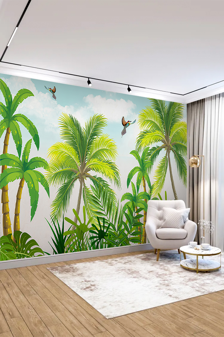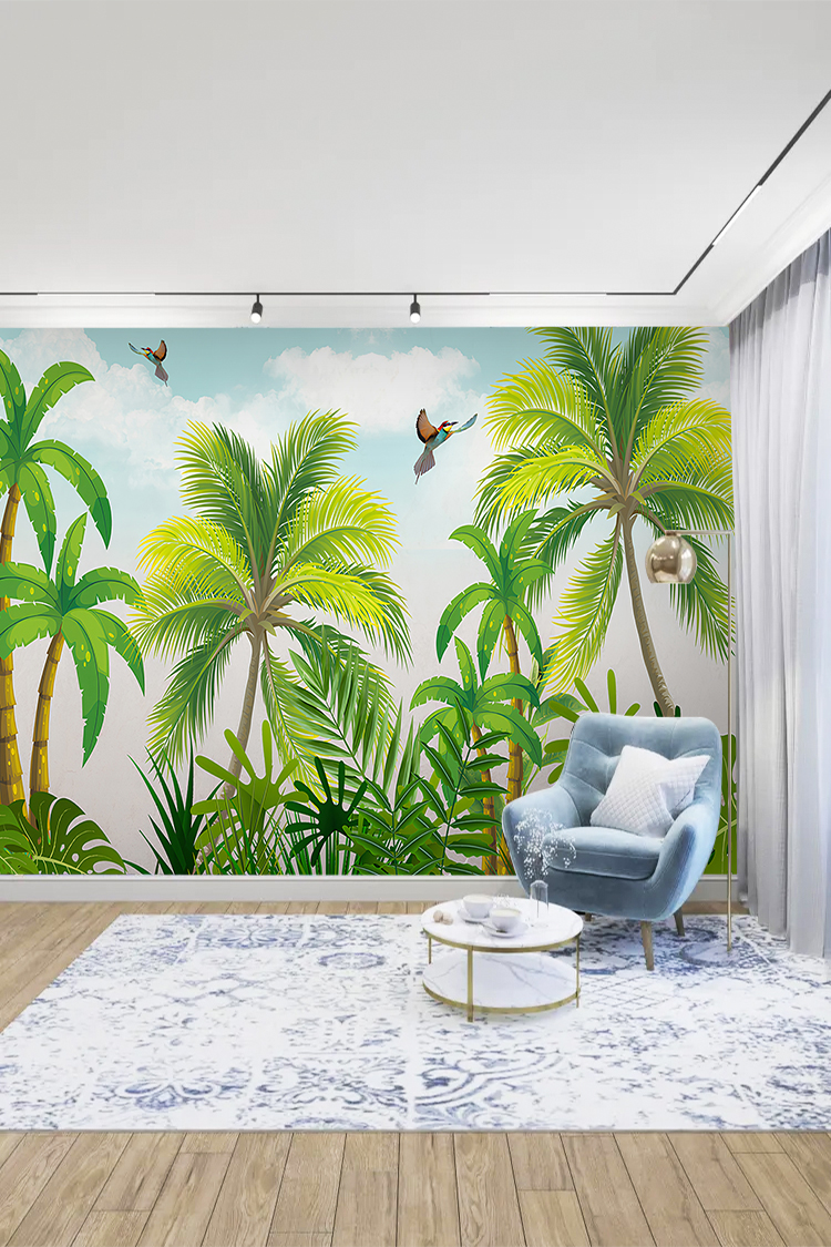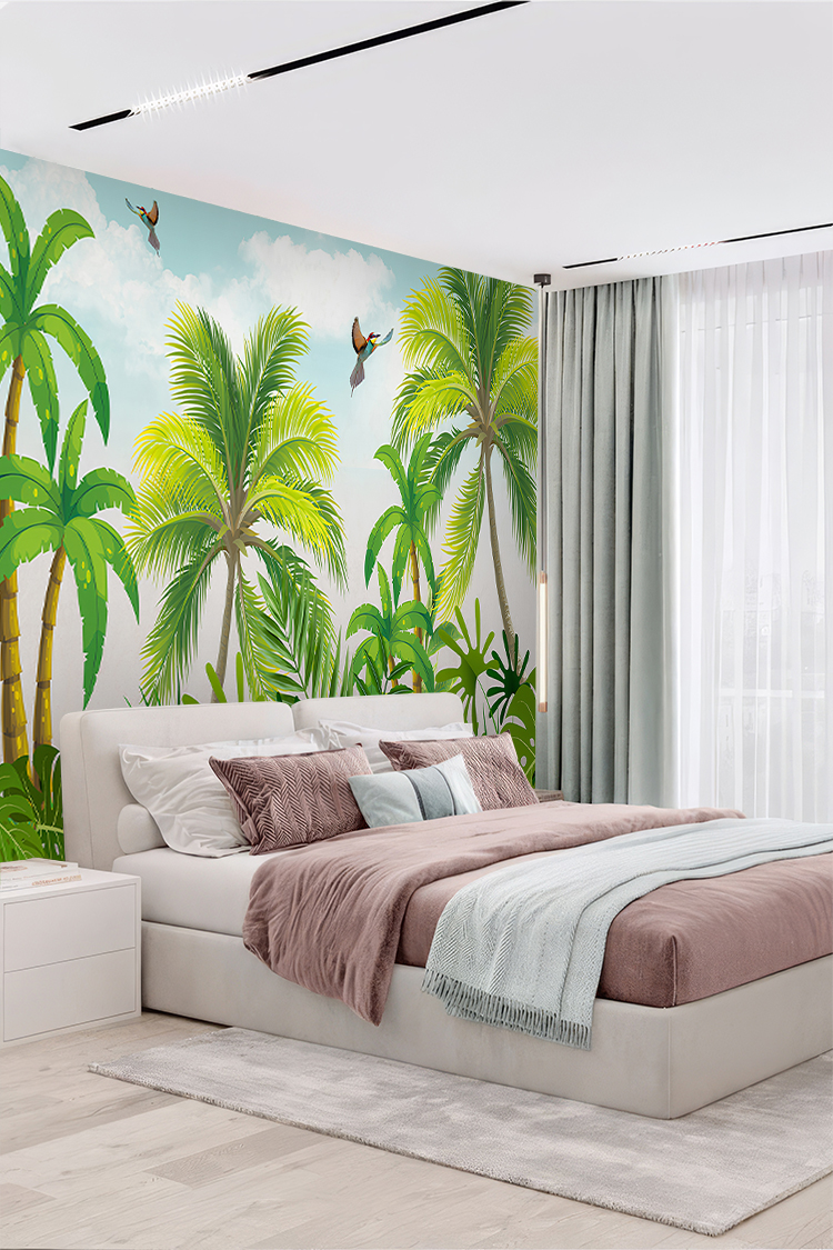 Tropikal Palmiyeler ve Kuş Desenli Duvar Kağıdı