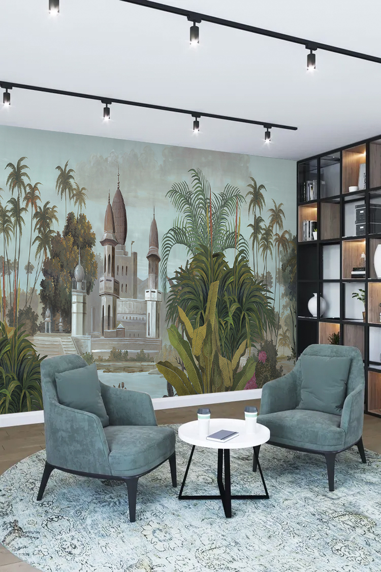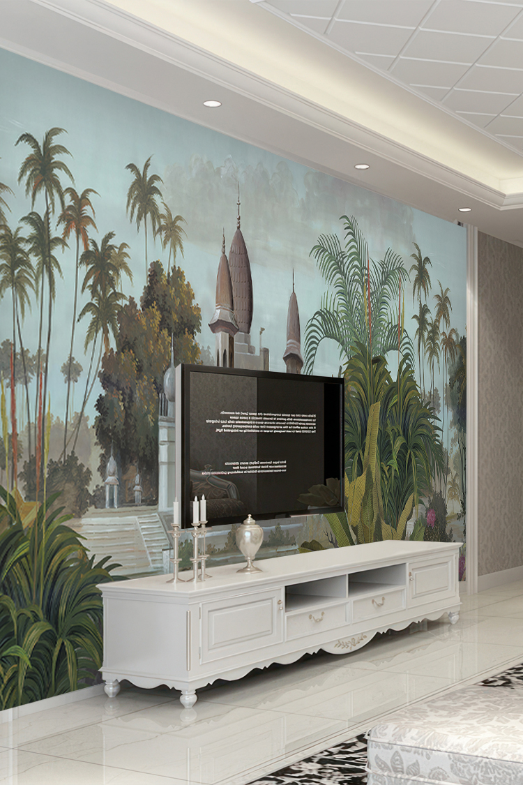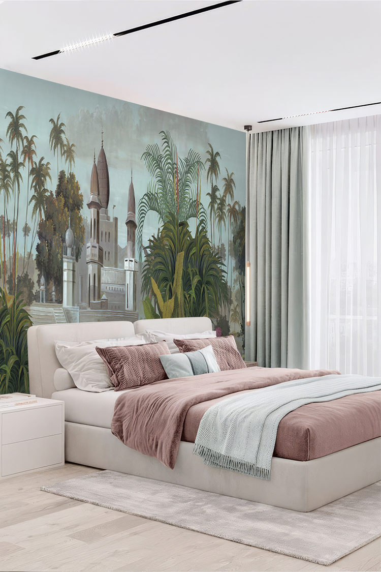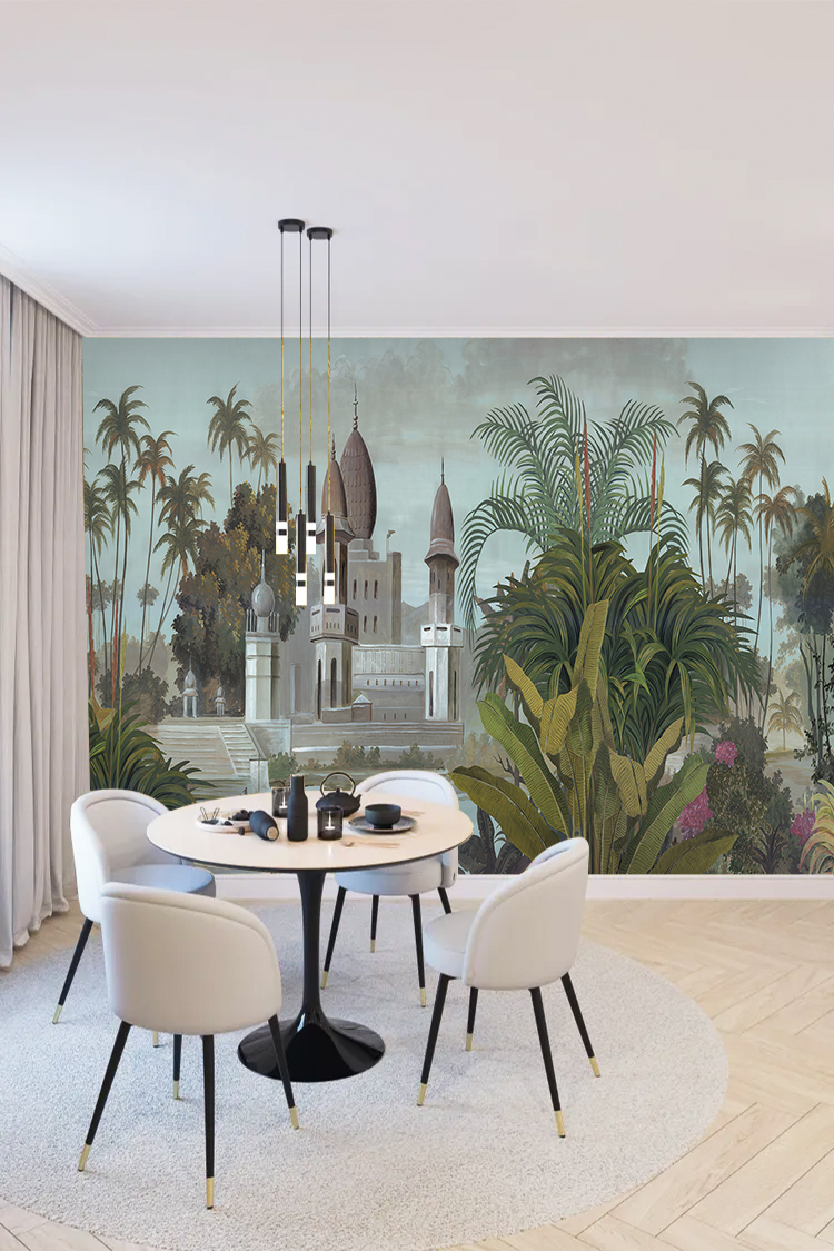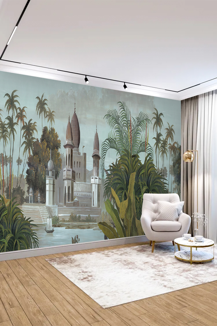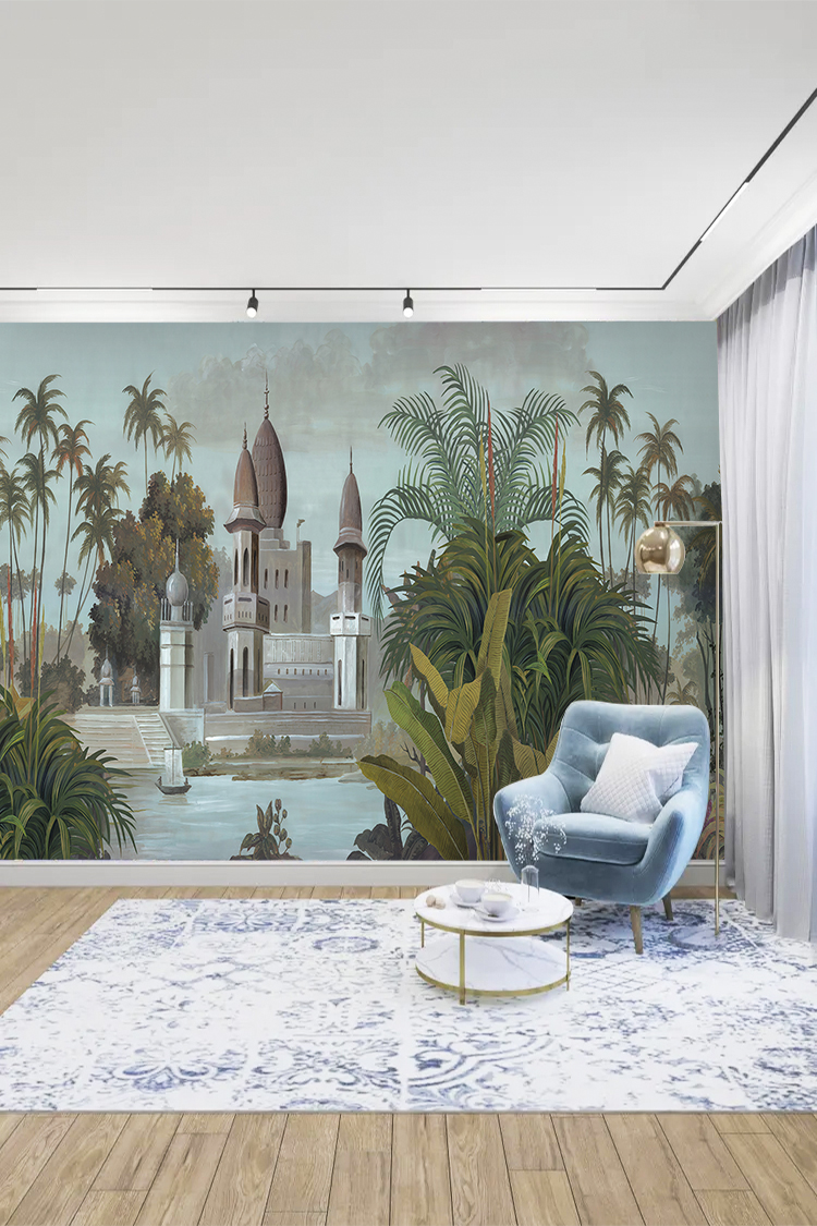 Tropikal Saray ve Palmiye Desenli Duvar Kağıdı