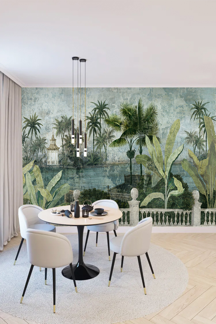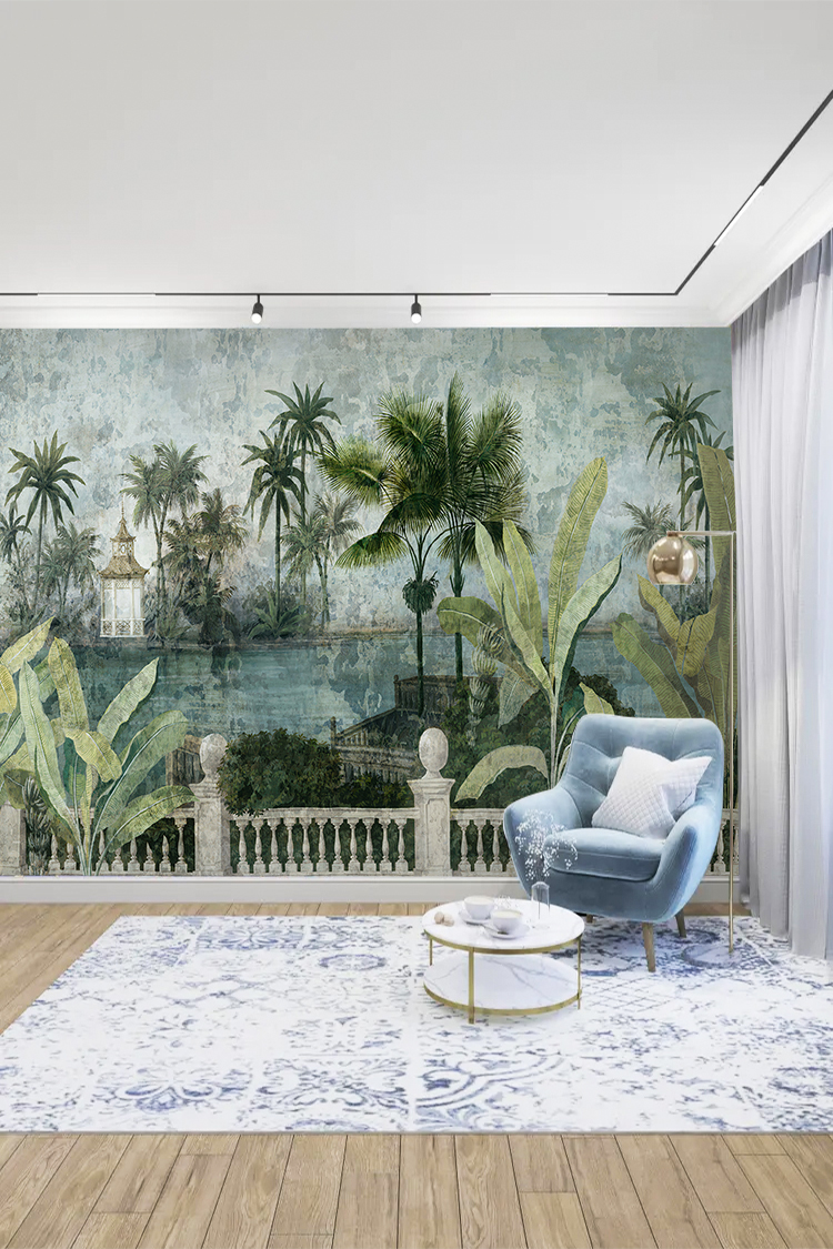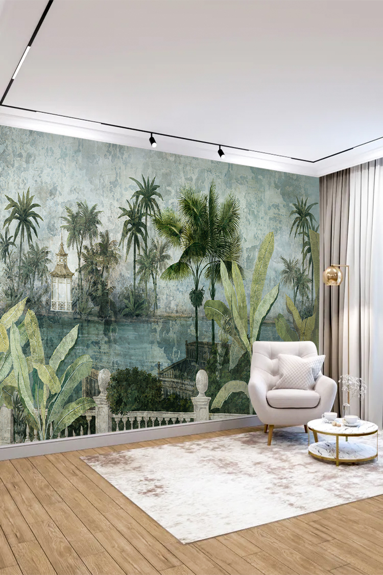 Tropikal Saray ve Palmiyeler Desenli Duvar Kağıdı