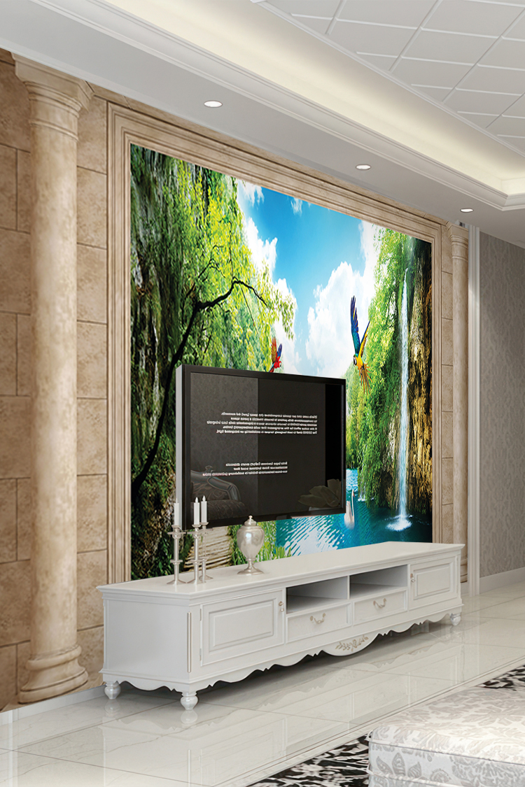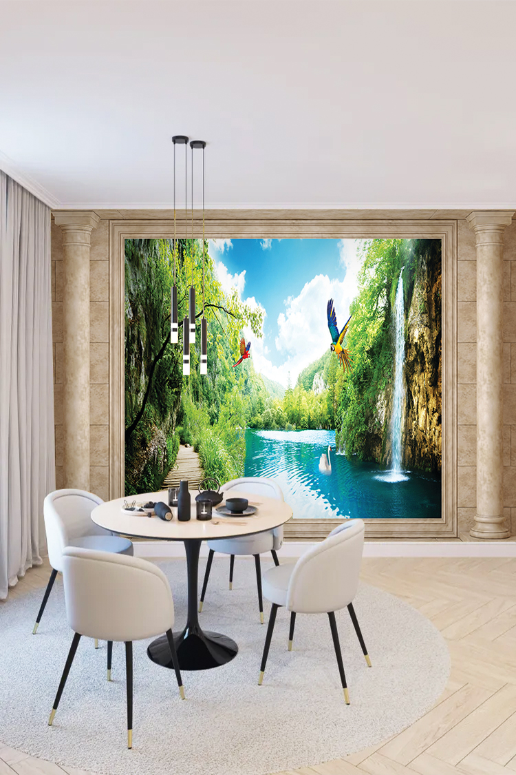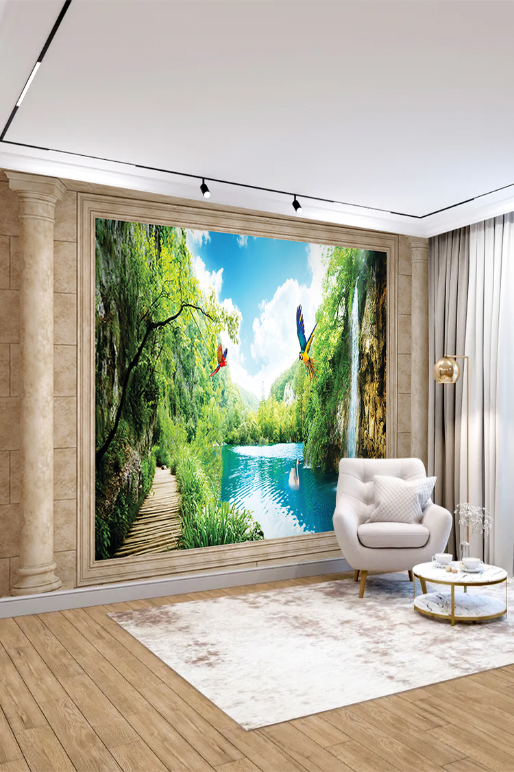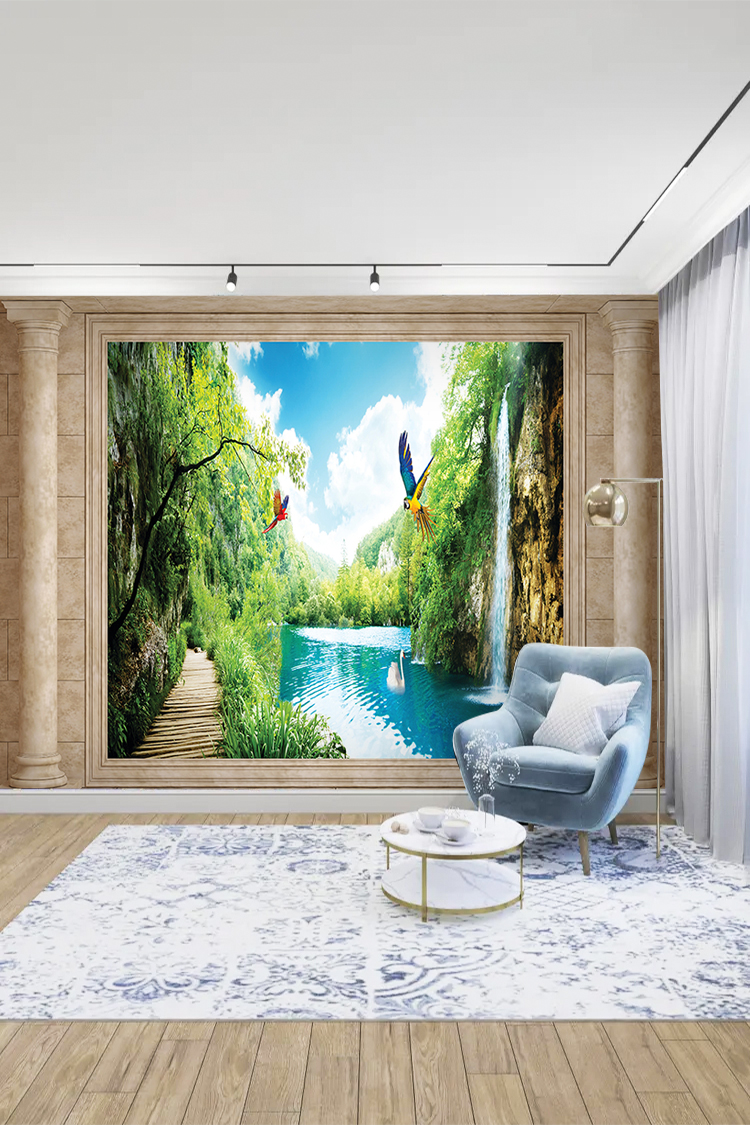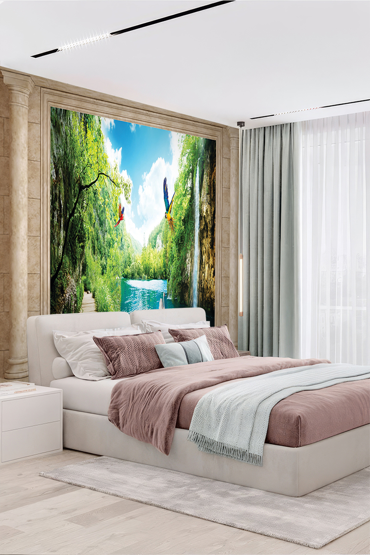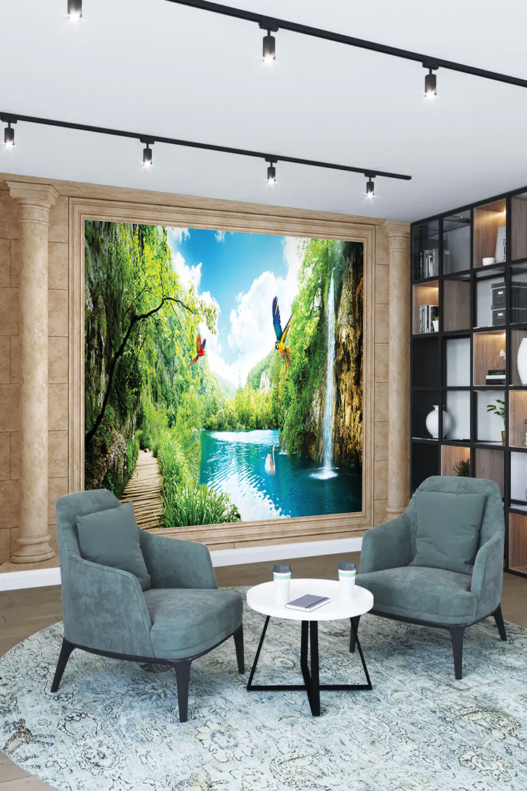 Tropikal Şelale ve Papağanlar Manzaralı Duvar Kağıdı