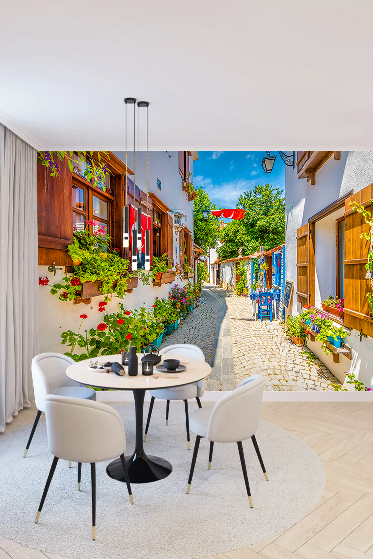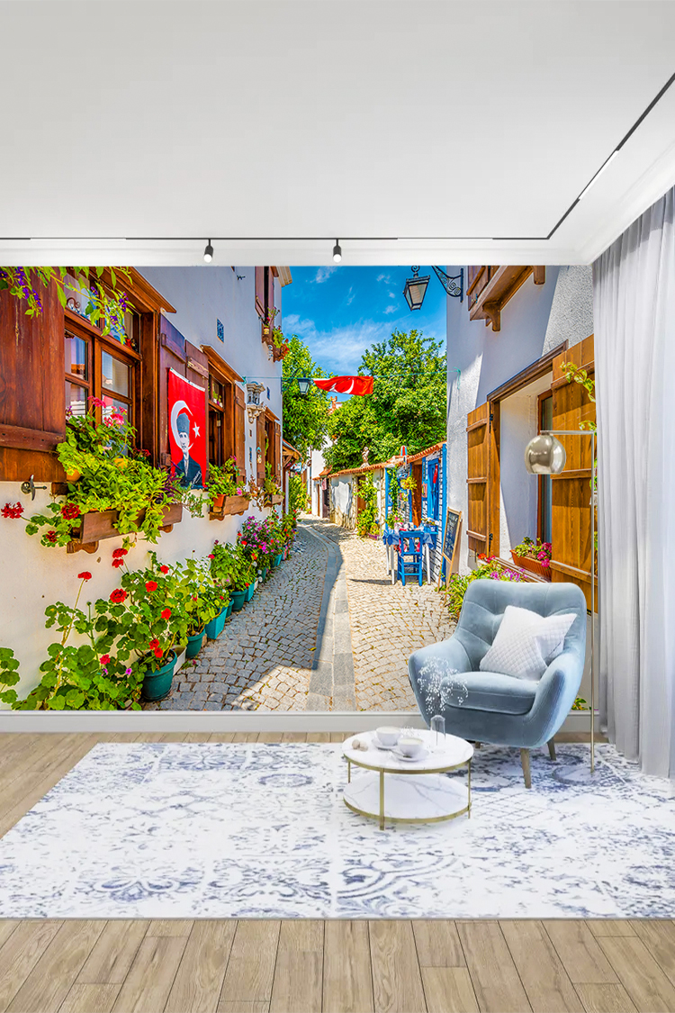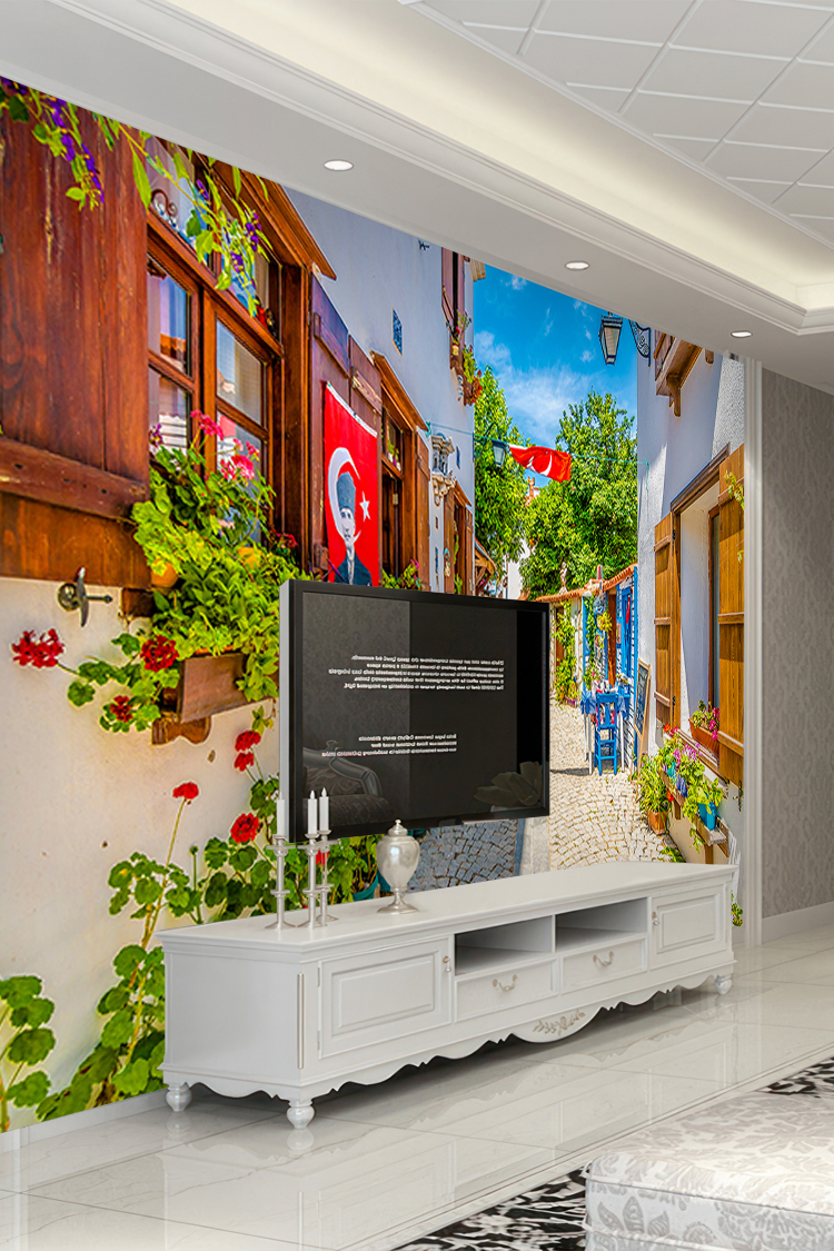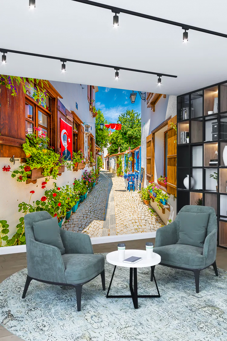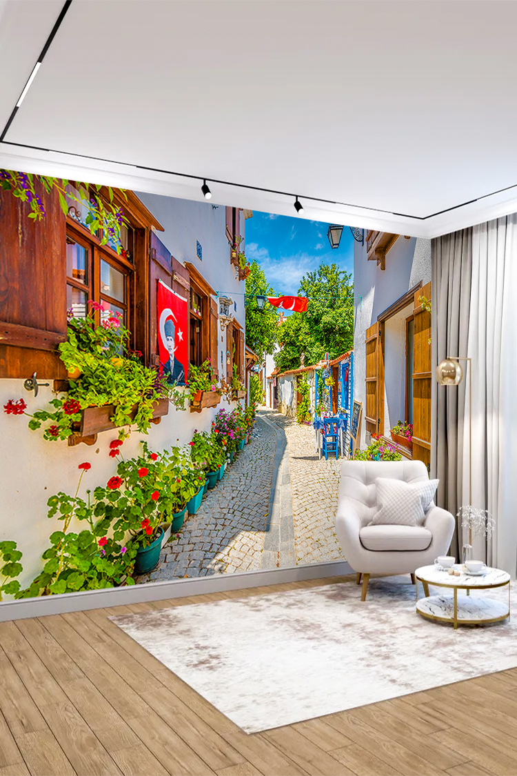 Türk Bayraklı ve Çiçekli Sokak Manzaralı Duvar Kağıdı