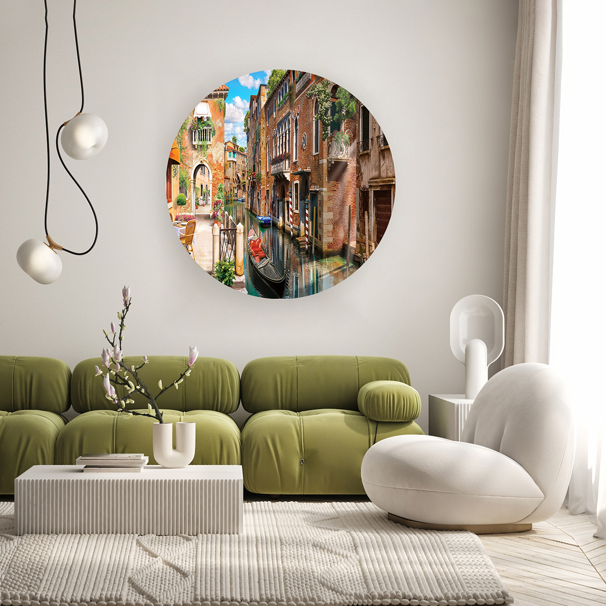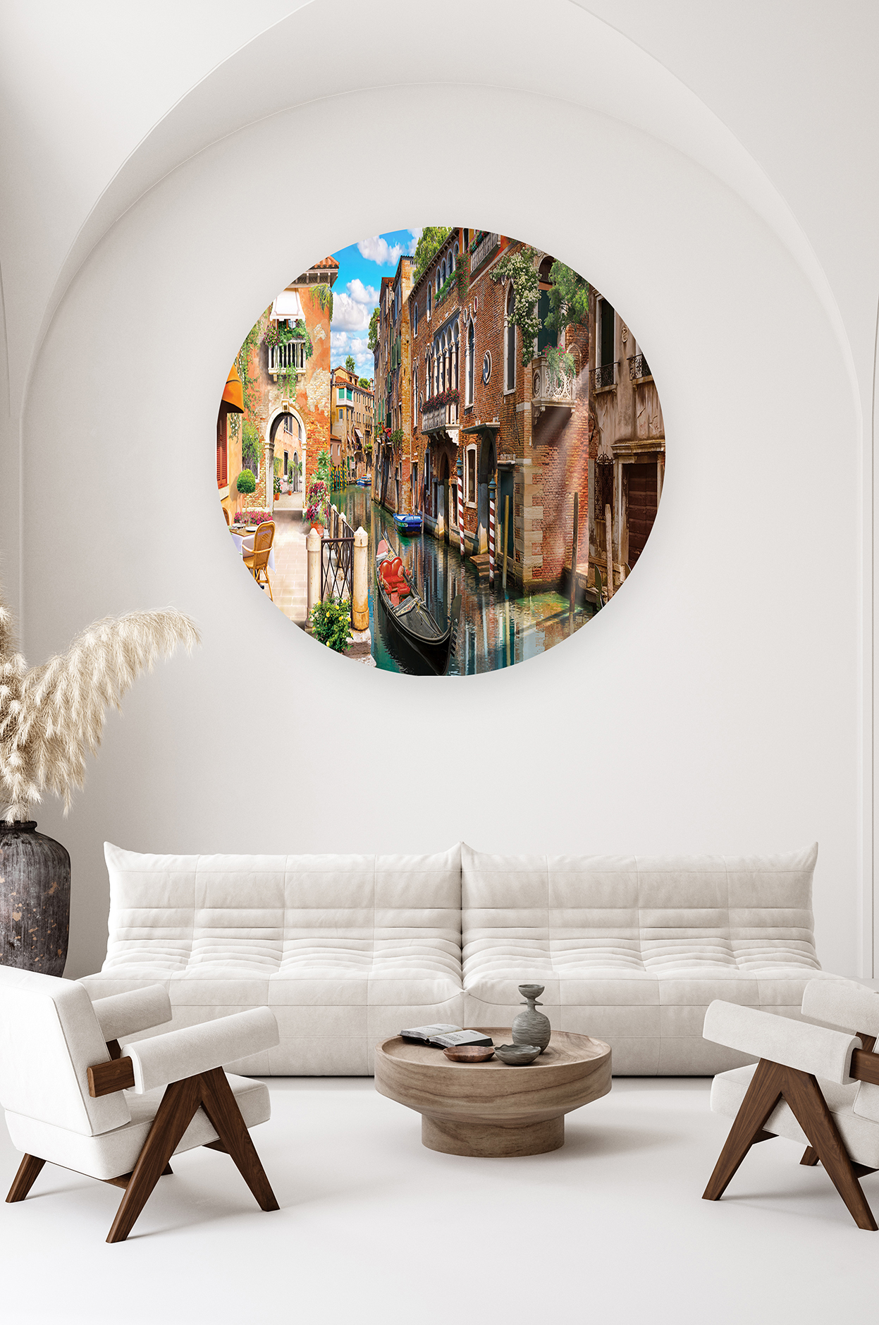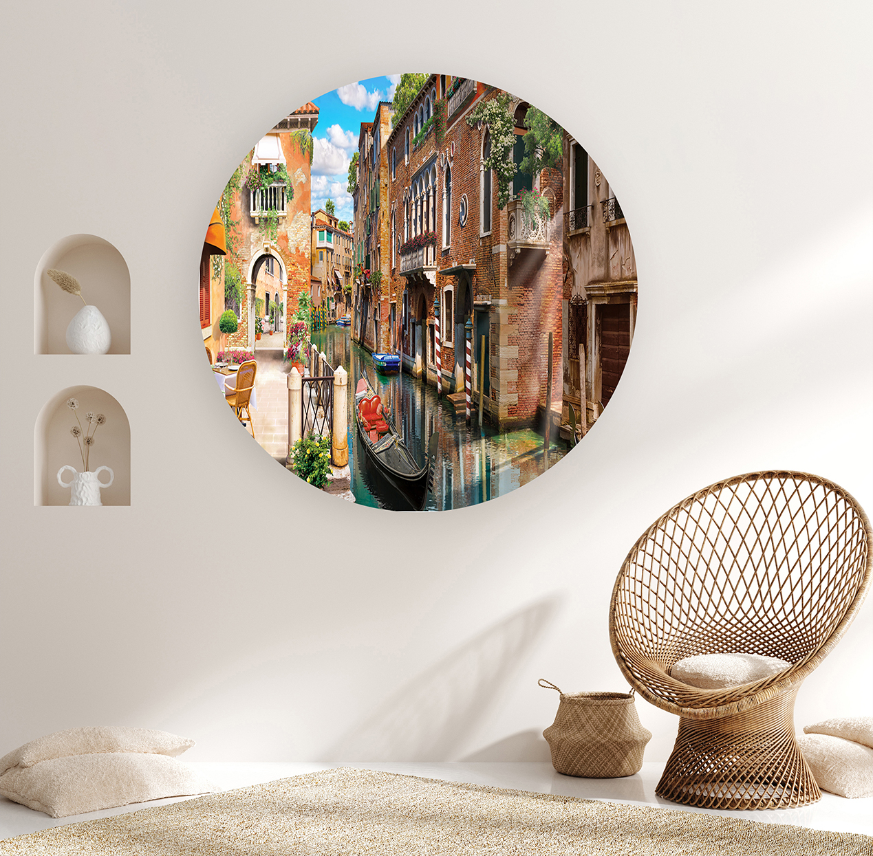 Venedik Kanal Manzaralı Yuvarlak Duvar Kağıdı – Renkli ve Modern Tasarım 🎨🚂
