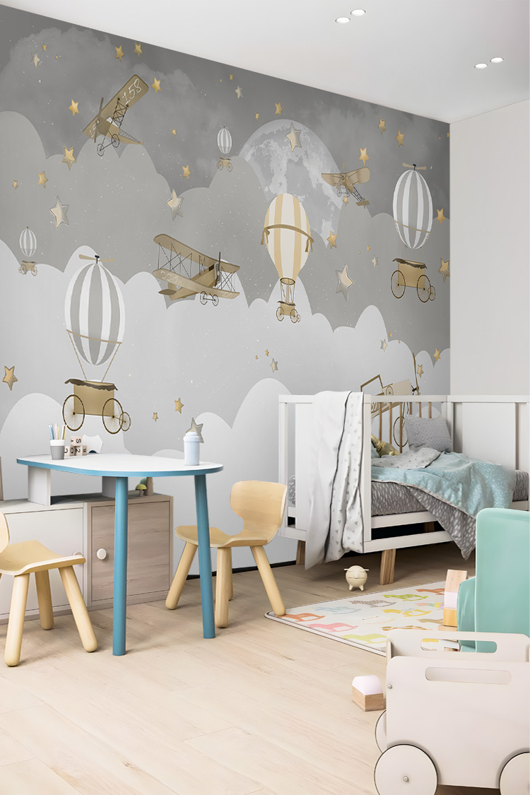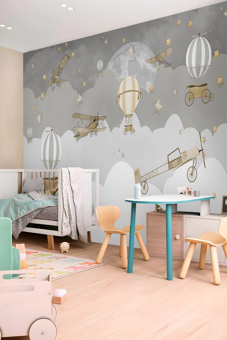 Vintage Uçak ve Balon Temalı Çocuk Odası Duvar Kağıdı