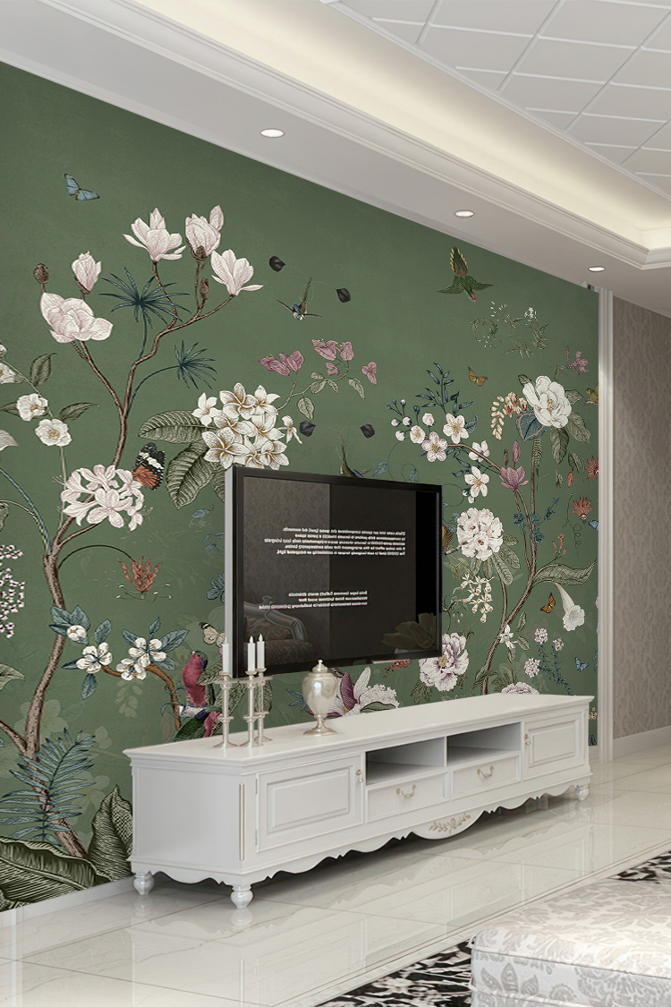 Yeşil Doğa Temalı Çiçekli Duvar Kağıdı
