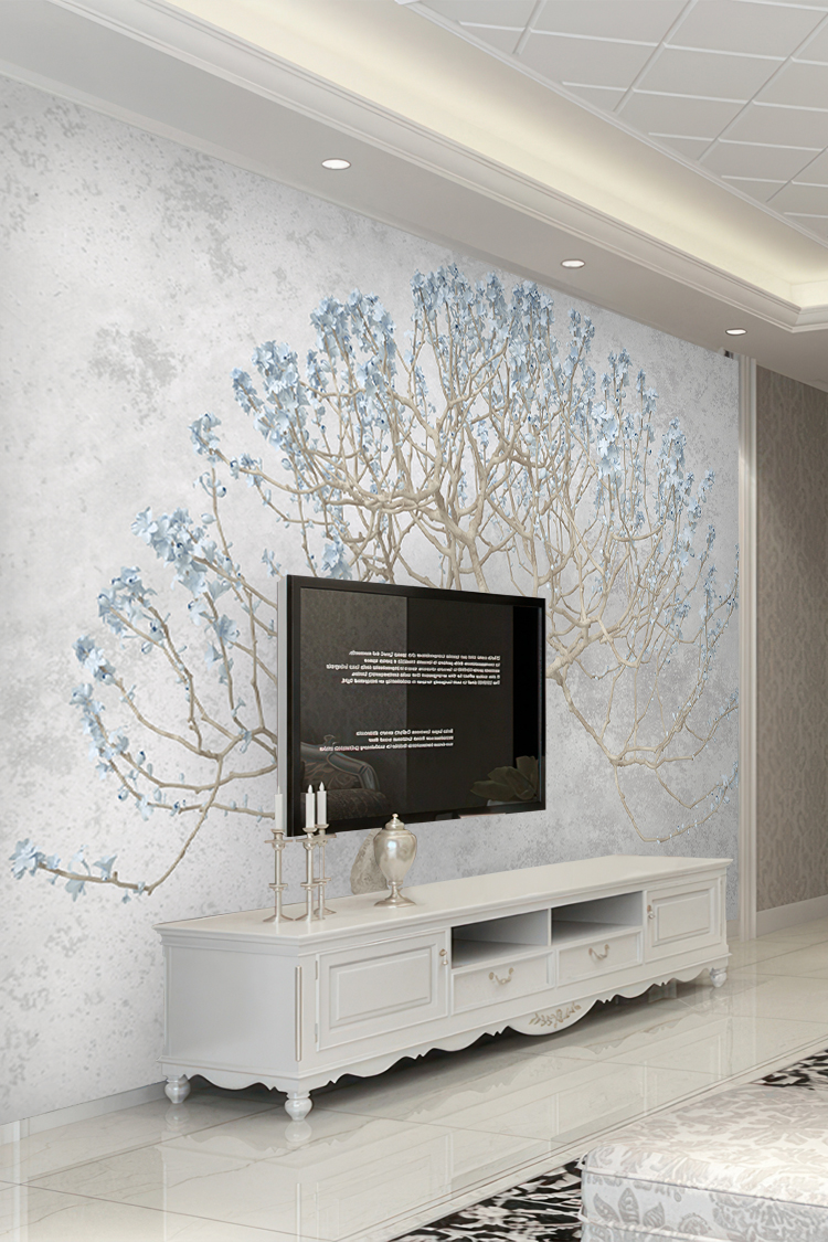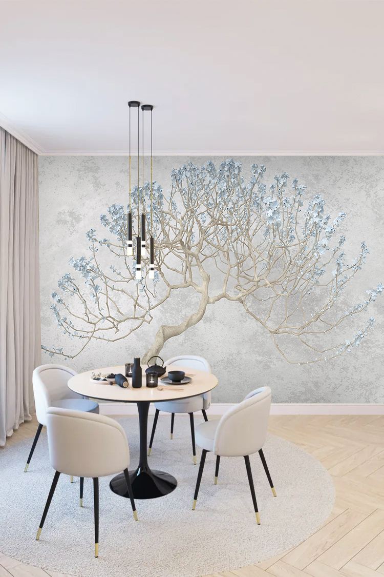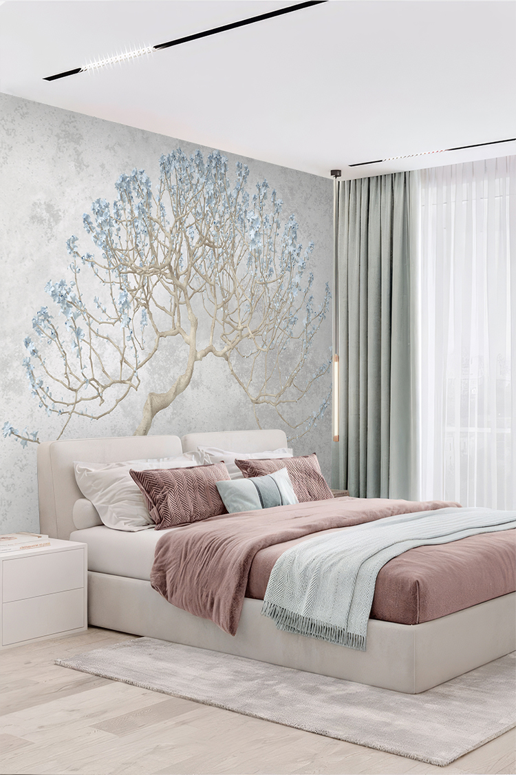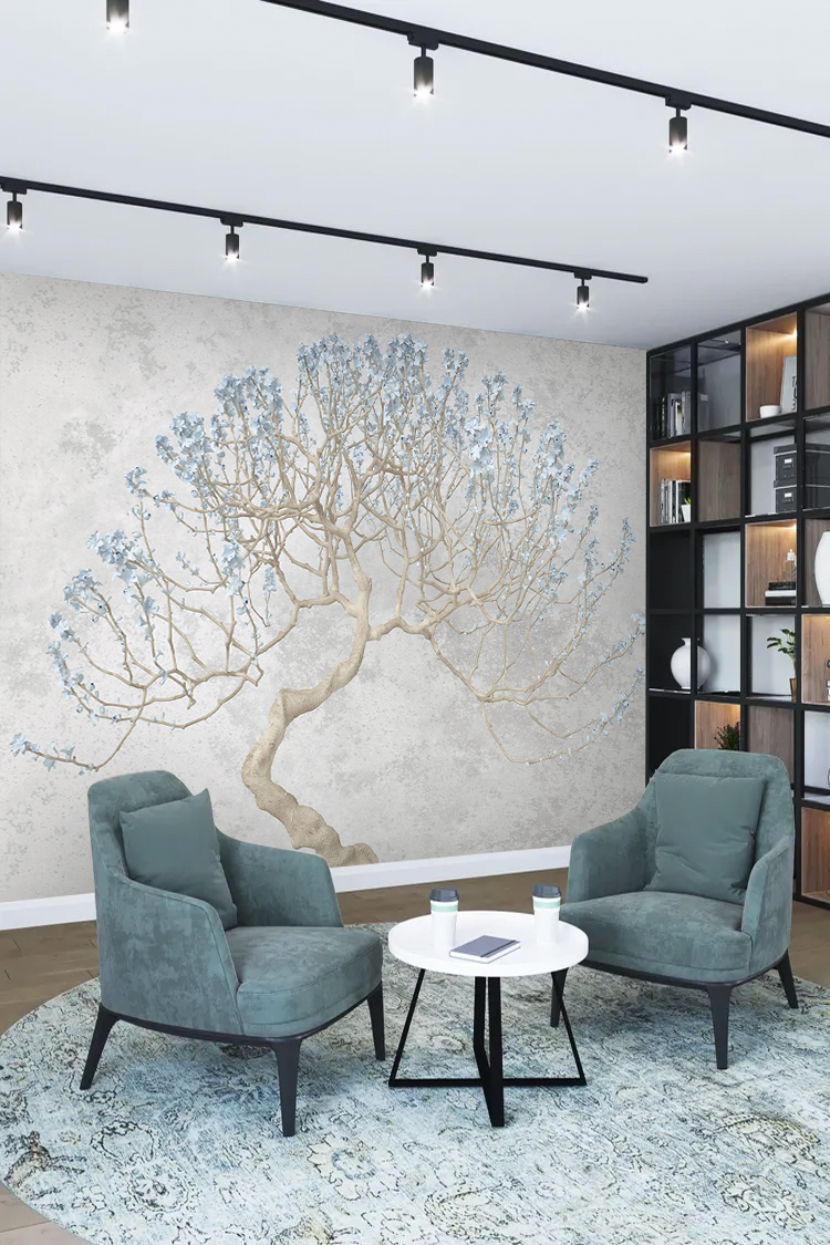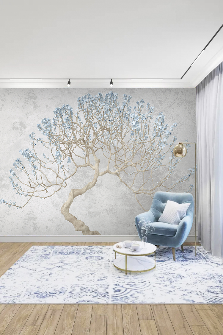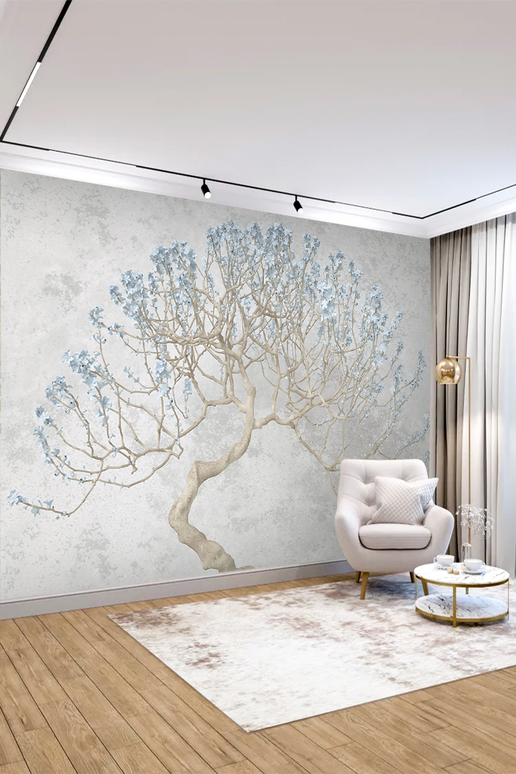 Zarif Ağaç ve Mavi Çiçek Desenli Duvar Kağıdı