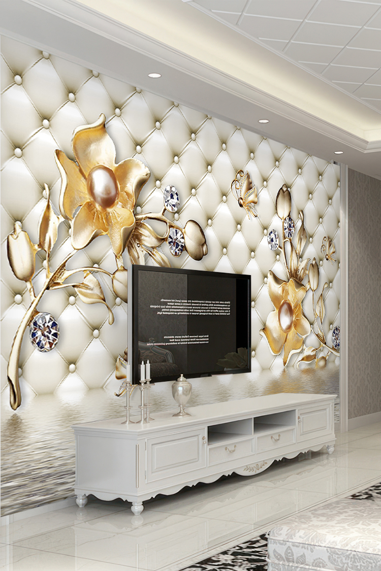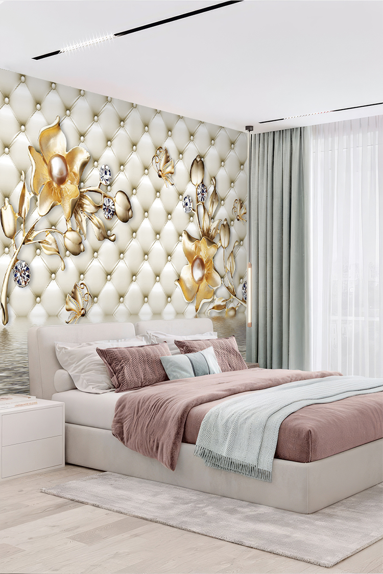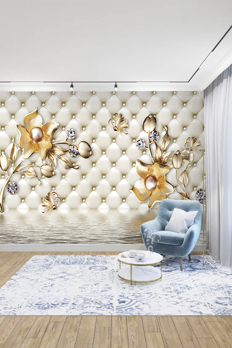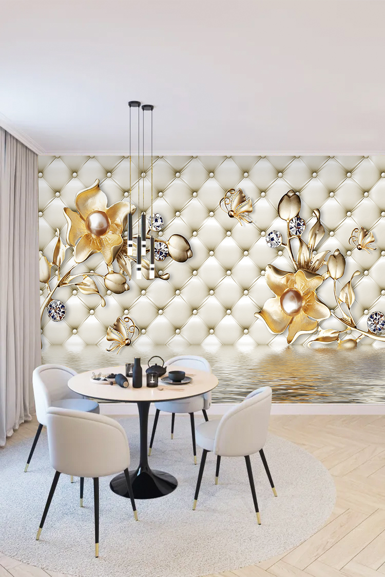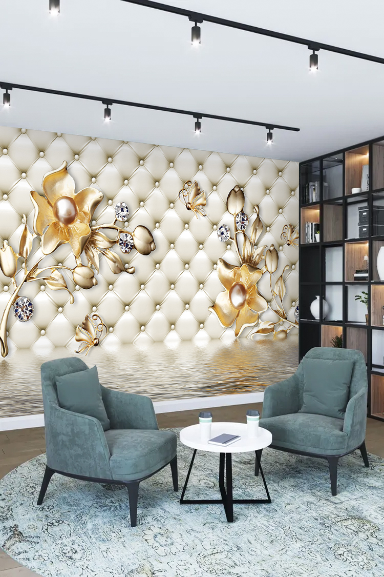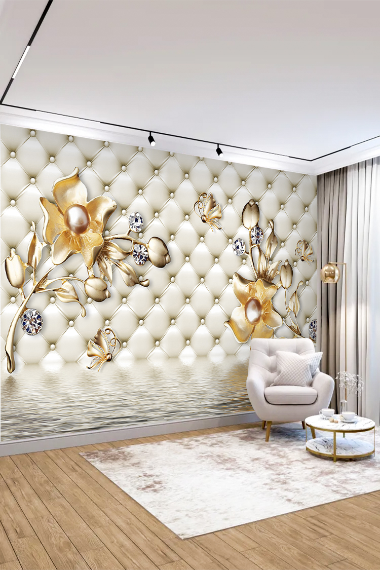 Zarif Altın Çiçek ve İncili Lüks Duvar Kağıdı
