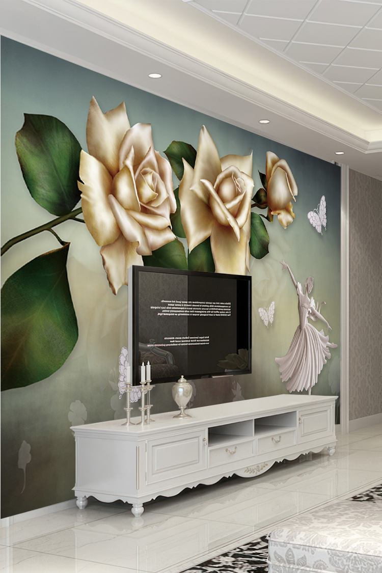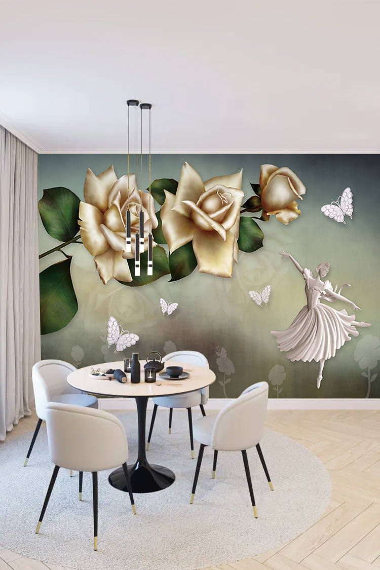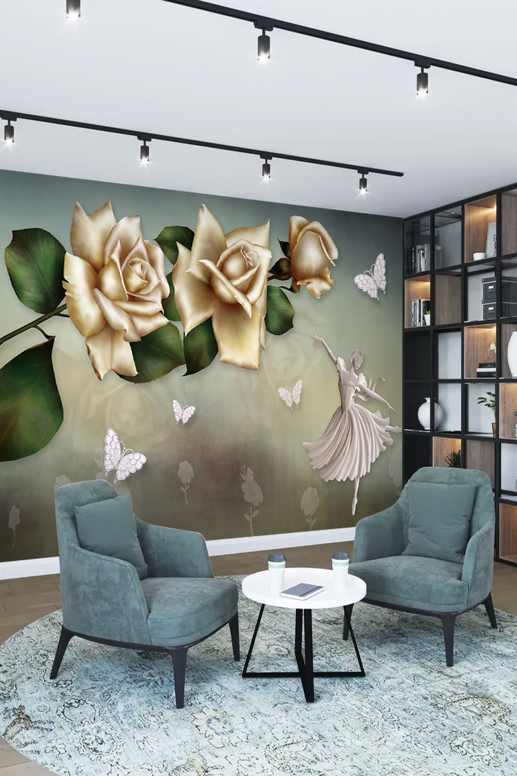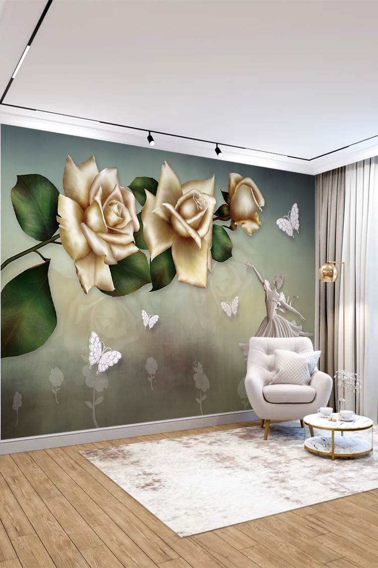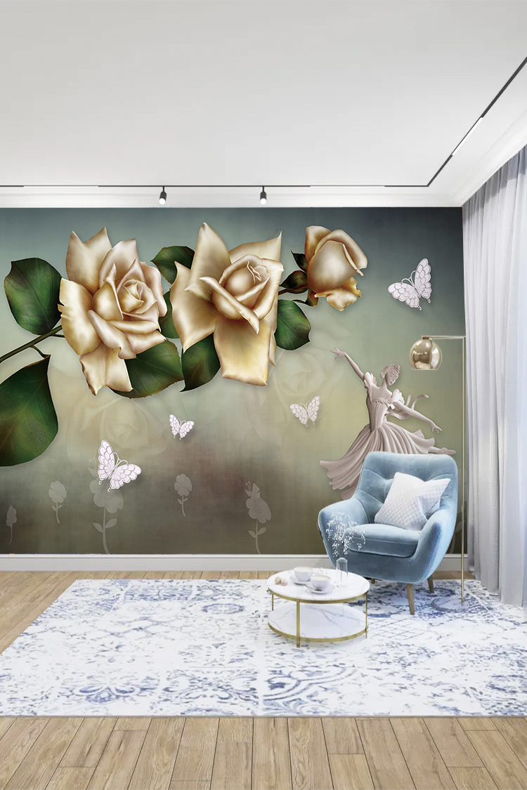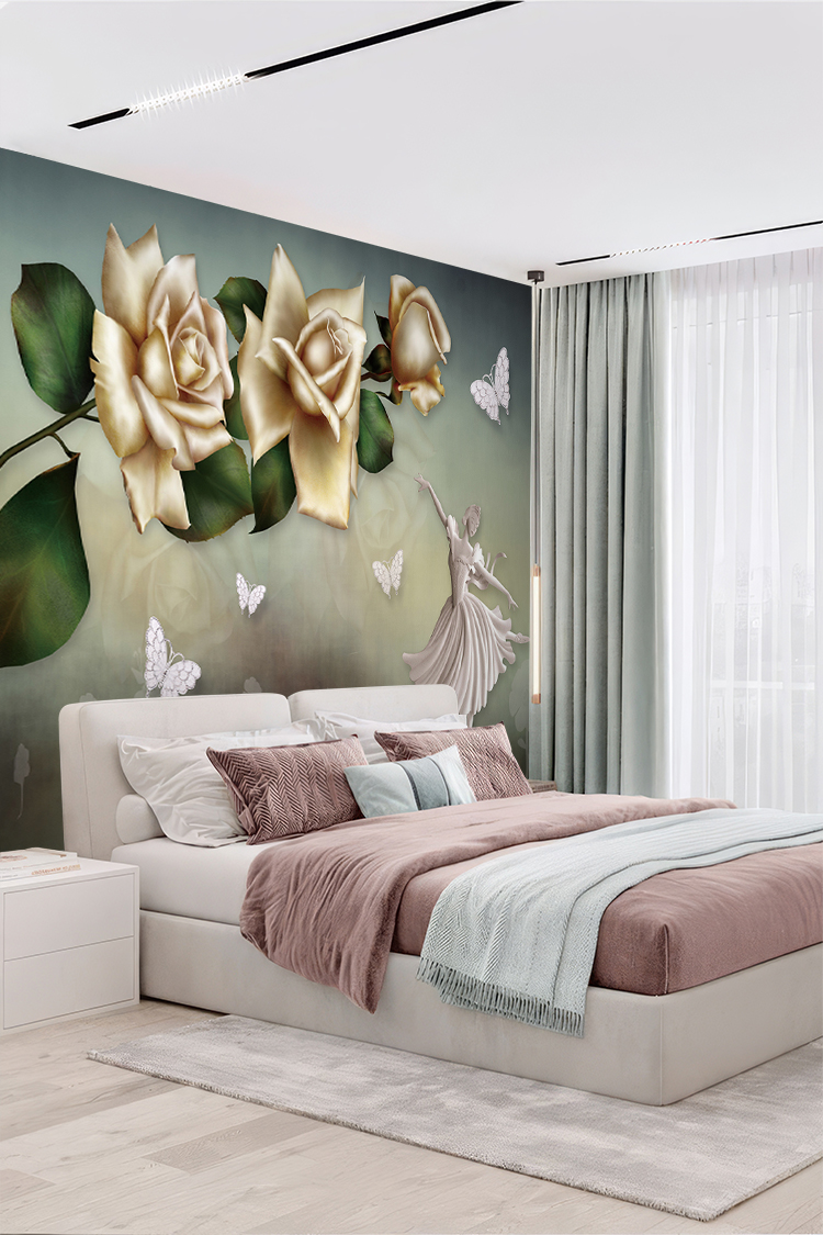 Zarif Altın Güller ve Kanatlı Desenli Lüks Duvar Kağıdı