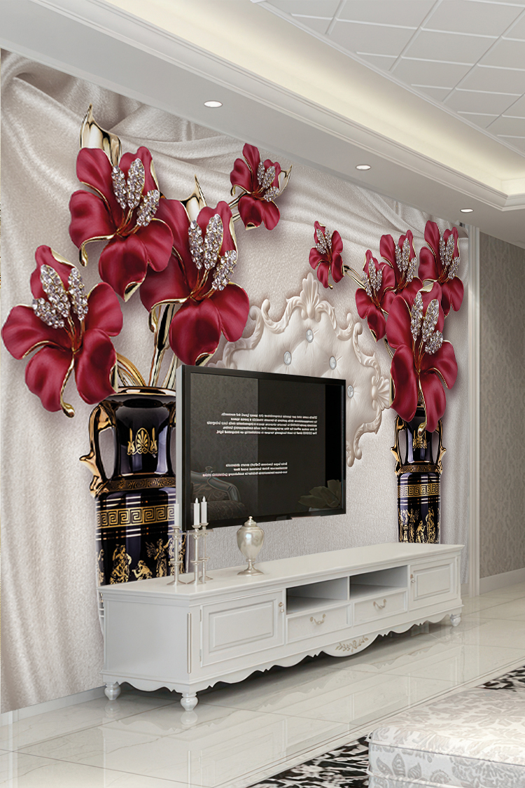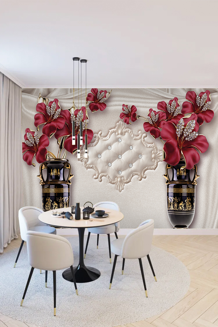 Zarif Kırmızı Çiçek Desenli Lüks Duvar Kağıdı